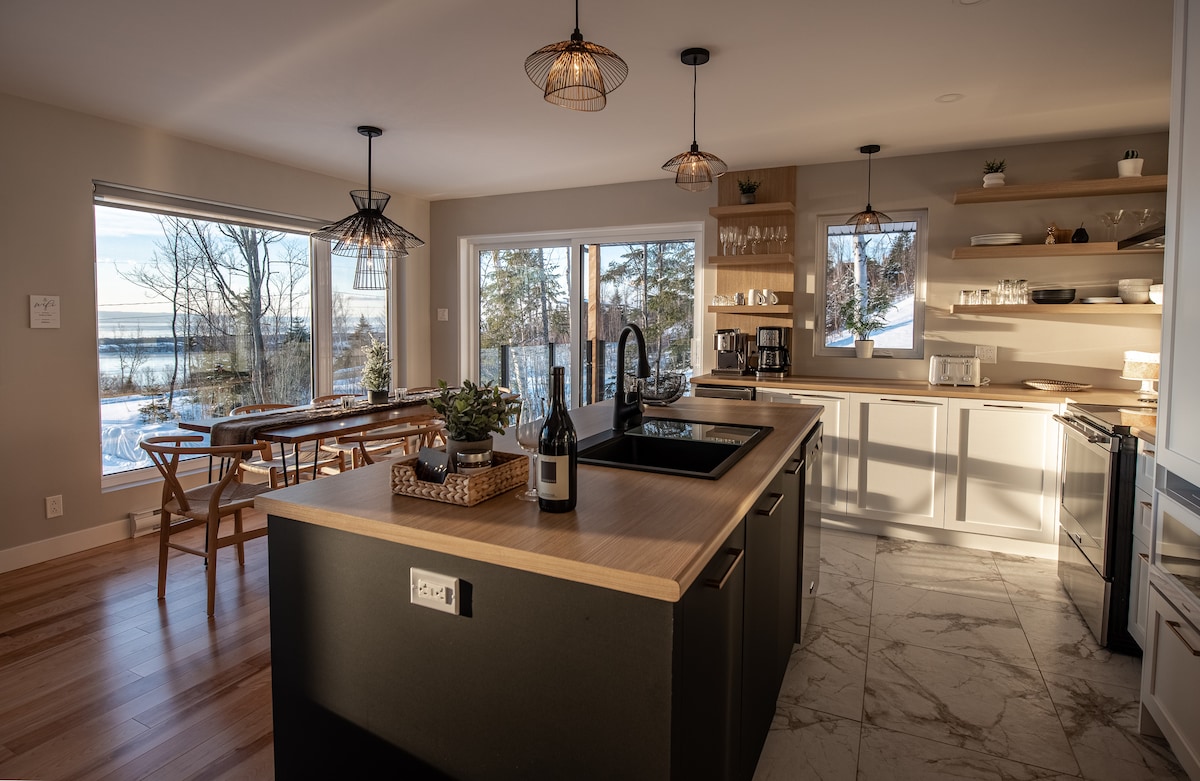 Small Scandinavian chalet for two people ideally located to enjoy the attractions of Charlevoix. It has a thermal circuit (hot tub, sauna, hammam) Very intimate and in the middle of the woods, the view overlooks the majestic river and the mountains in the distance. All the modern equipment is there and the comfort is absolute A/C and outdoor fireplace. The open concept design was designed for an immersive experience in nature: large windows, panoramic shower. Access via a private road at 500 m.