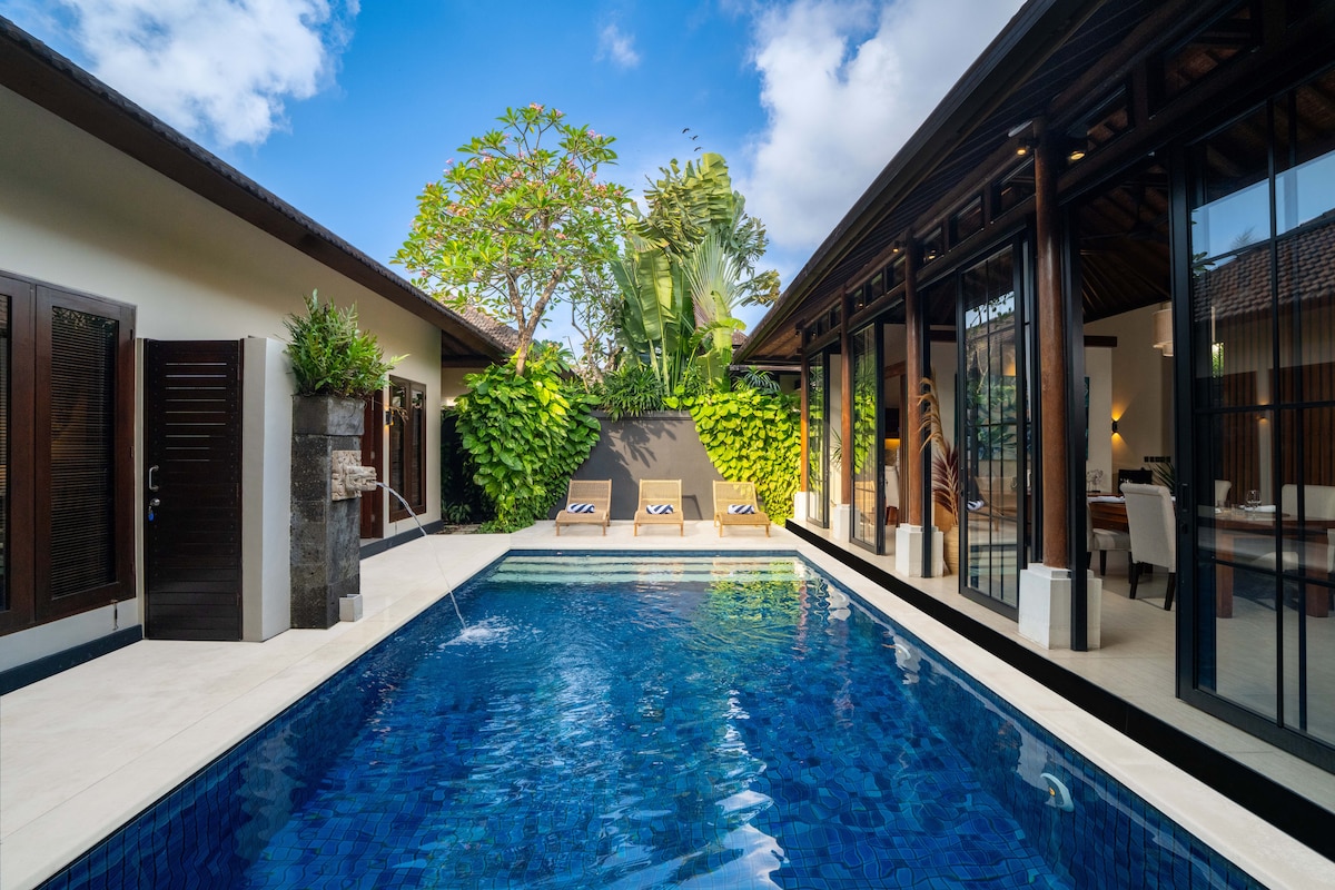 We offer a true Balinese experience with the comforts of a western stylishly designed home. Villa Santai features 2 large AC bdrms with 2 en suite btrms w. hot shower and one extra AC bdrm (single bed no ensuite). It has an open air living space ( up to 80 mbps internet) & a refreshing pool. This villa offers plenty of relaxation space & even though it’s quiet; it lies at walking distance from Seminyak square. Its perfectly situated tucked away in private & secure street.
