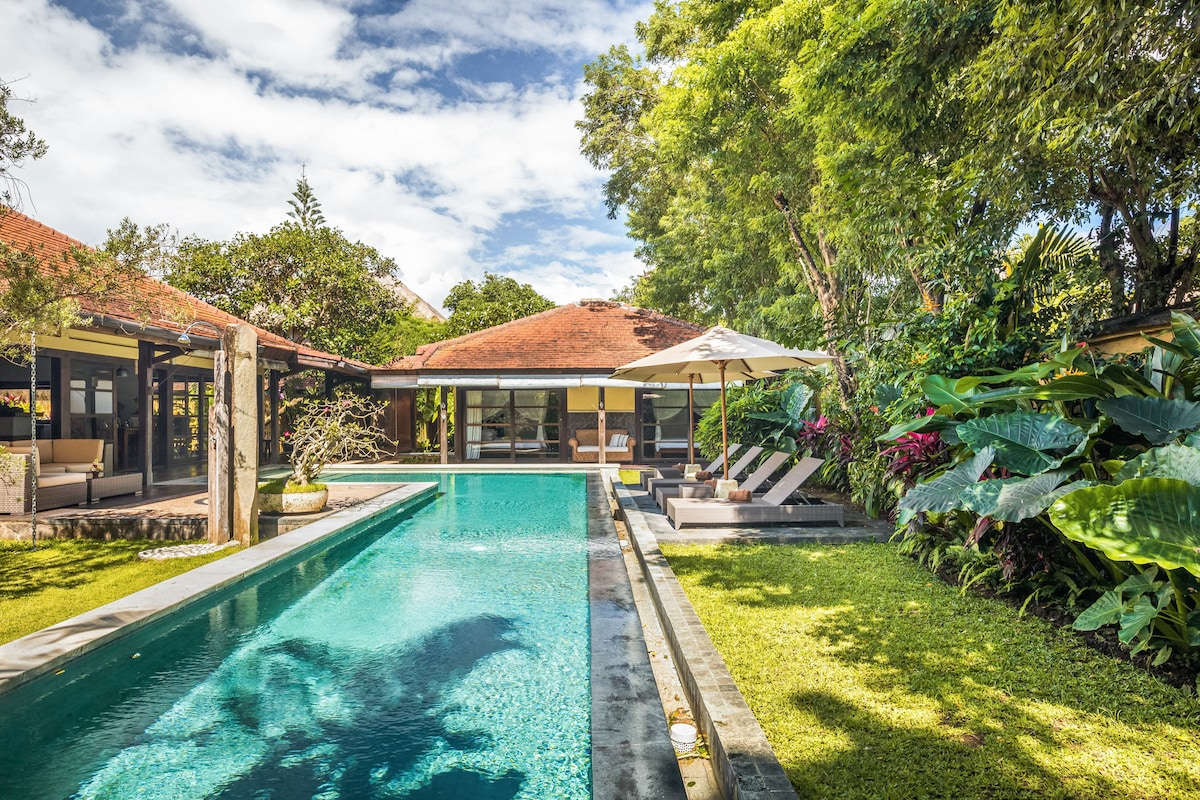 Villa Lodek Deluxe is a hidden gem in the heart of Seminyak, offering a private tropical retreat surrounded by lush gardens with palms, frangipani, and natural bamboo. Wake up to the melodies of wild birds, a rare treat in this vibrant district. The villa boasts a spacious lawn, a long pool, and elegant colonial design.