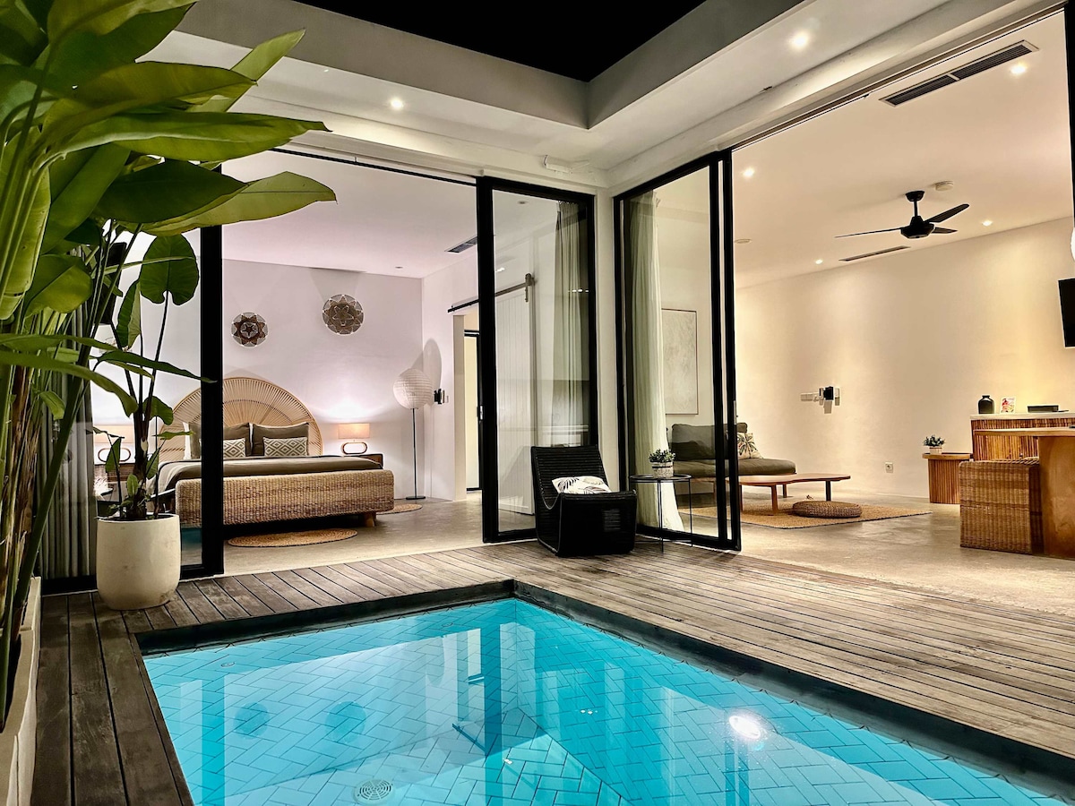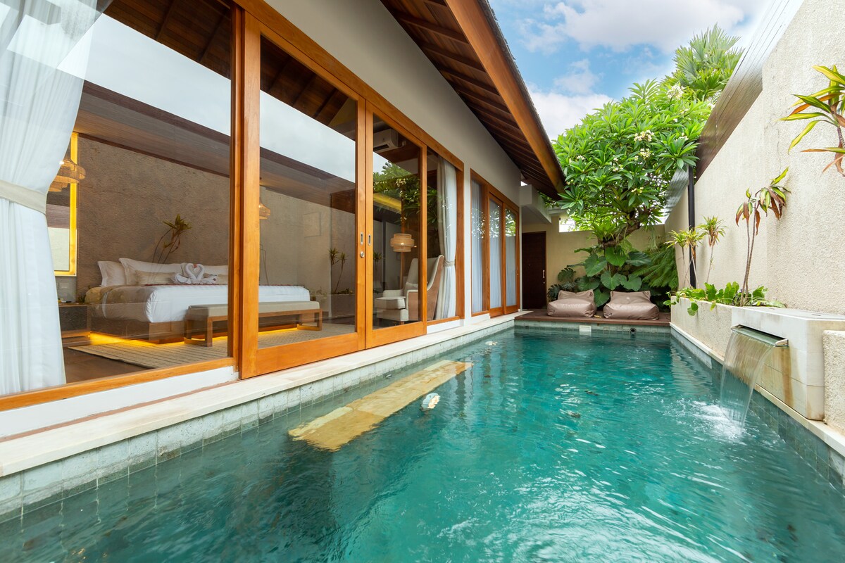 Enjoy your romantic private times in a luxurious complex, close to a fine selection of world-class cafes, restaurants and beach clubs. But perfectly hidden in a serene and quiet villa neighbourhood. This villa features an ensuite bathtub and offers a perfect dip-in pool. Enjoy your floating breakfast under the wood panels with sunlight gently pouring through. Chillax on the bean bag or sun loungers at your choice while soaking up the view of the garden.