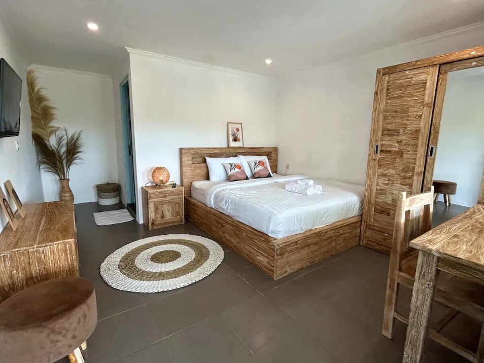 Discover a modern guesthouse in Pererenan with beautiful views of the surrounding rice fields. Our peaceful setting is ideal for relaxation. Enjoy meals by the pool or delivered to your room from our on-site restaurant. With reliable internet throughout the property, working remotely is effortless. Choose between our loft apartment with a kitchen or one of our comfortable rooms for a stay tailored to your needs.