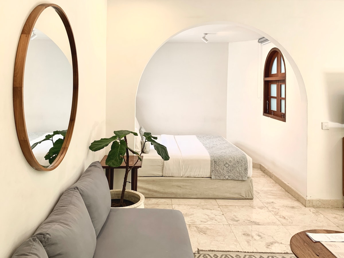 Perfect for travelers looking to relax in the heart of Canggu. Located in a charming boutique hotel,300 m from the ocean, this 1 bdr apartment has 1 en suited bathroom with shower and a big living. Enjoy our facilities: two magnificent swimming pools, a spa, a wellness studio and a coworking space. The hotel bar offers refreshing cocktails. Whether you are here for surfing, wellness or simply to recharge your batteries, our hotel is the perfect place for an unforgettable experience in Canggu