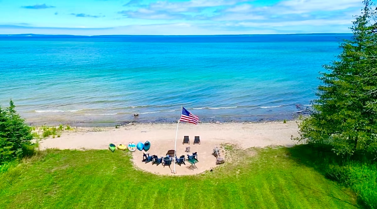 Stunning modern home with 150 feet of pristine private beach at the edge of Lake Michigan's Grand Traverse Bay. Come restore your body and spirit at our new house nestled on 2 acres of sandy woodland with access to great cycling and hiking trails. With toasty radiant floor heating and high speed wifi, this home can be your sanctuary for work or creative reflection. Enjoy the modern wood-burning fireplace and outdoor sauna, Peloton bike, yoga supplies and extraordinary lake views.
