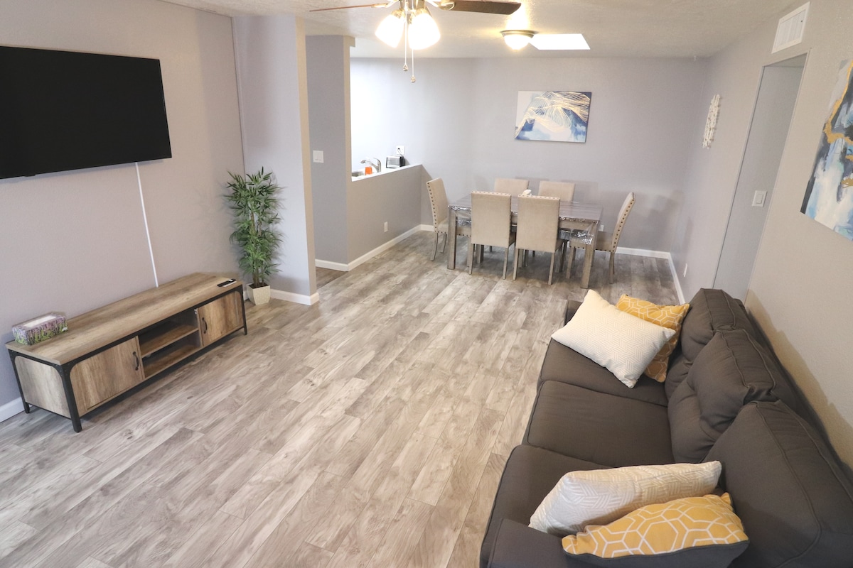 Update 01/07/2026: New Mattress in Main Bedroom. Modern 3 bedroom 2 bath home equipped with all necessities in the kitchen with stainless steel appliances. There is a dining room table with sitting for 6. There are two queen beds, one twin bed and a dedicated work space. Two full updated bathrooms, great floor plan with an open living area. Living room features 50-inch smart TV with high speed internet.