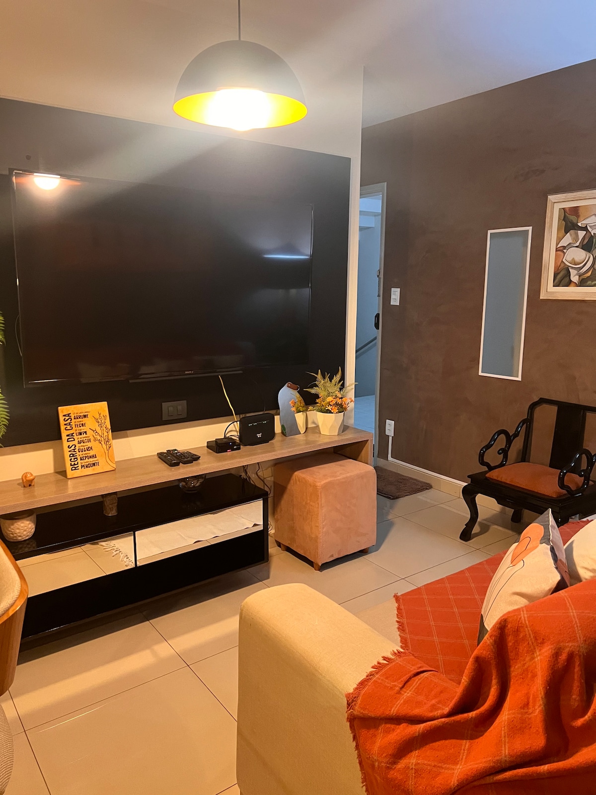 Sala iluminada e confortável Com sofá amplo, poltronas de design, TV Smart, plantas naturais e decoração inspiradora. Sala com ar condicionado. Não recomendo para crianças pequenas* 🍳 Cozinha completa e equipada Com geladeira, fogão, forno, micro-ondas, filtro de água, air fryer, cafeteira e todos os utensílios. Pronto para você se sentir em casa. 🛏️ 2 Quartos • Suíte principal com cama padrão casal, ar-condicionado, TV. • Quarto auxiliar com bicama, ar condicionado 🛁 1 banheiro social