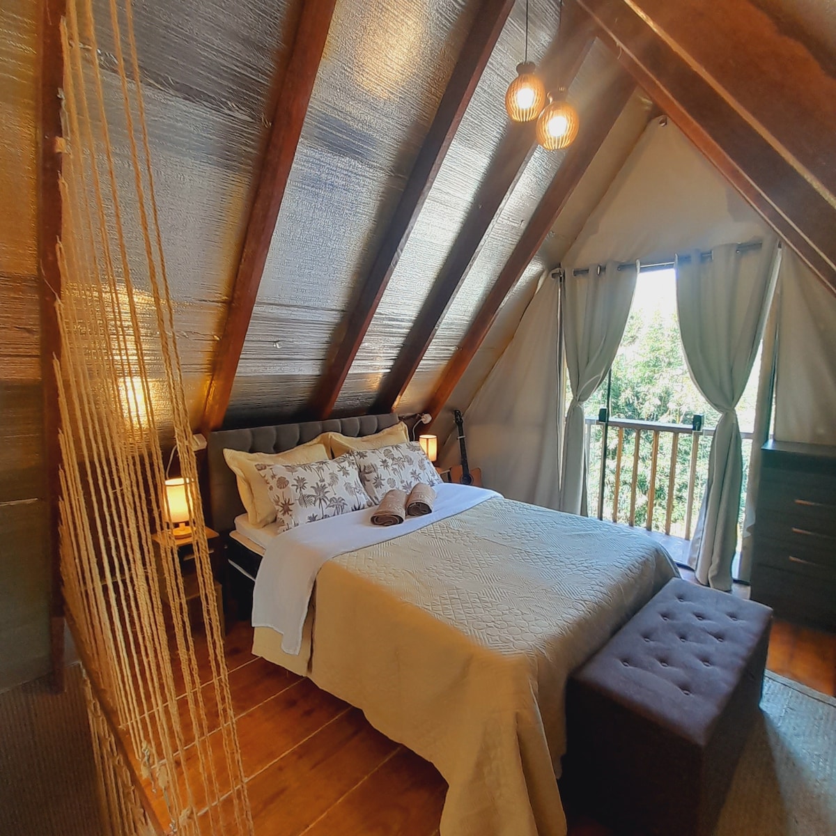 Este lugar único tem um estilo próprio. A cabana foi carinhosamente planejada para propiciar conforto em meio a vegetação. Grandes janelões de vidro fazem a separação do ambiente interno do externo, mas, sem perder a privacidade, pois há cortinas com blackout. Na área externa há um amplo deck com móveis, rede e churrasqueira. Parte do material utilizado para a construção é de demolição, causando menor impacto no meio ambiente. A decoração é composta por peças feitas especialmente para o espaço.