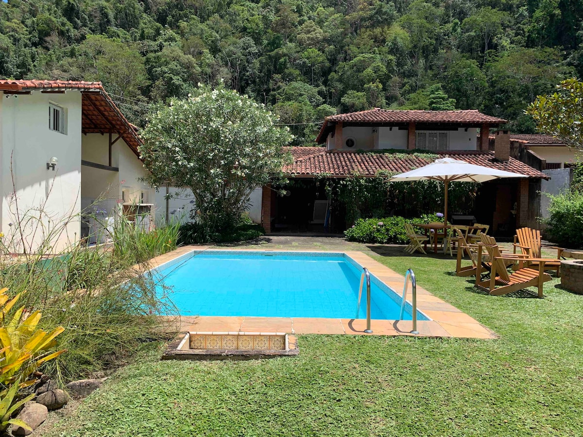 Tranquilidade e beleza a apenas 3km do Centro de Petrópolis. Sossego e segurança próximo ao Parque Nacional da Serra dos Orgãos, c a comodidade e diversão da Cidade Imperial. Ótimo p quem curte passeios históricos e gastronomia local e não abre mão de tranquilidade, segurança e muito verde. Próximo a trilhas famosas e cachoeira. Ideal p famílias, casais e amigos. Suíte c cama de casal, bicama, TV stick c android, frigobar, cozinha completa. E, um belo deck de frente a piscina p aproveitar.