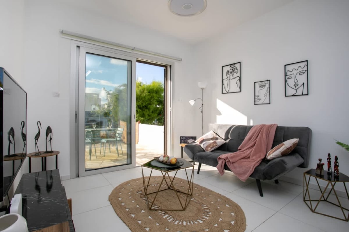 Relax in this cozy ground floor studio apartment with stunning views of the sunset and the sea! …. all within walking distance to bars, supermarkets, the mall restaurants and venues. Choose to have breakfast sitting by the natural shade of a lemon tree and listening to the mesmerizing sound of the waves! This classy studio apartment boasts open-plan living, an ideal base to explore Paphos. Wonderful for a couple or a couple with 1 or 2 children!