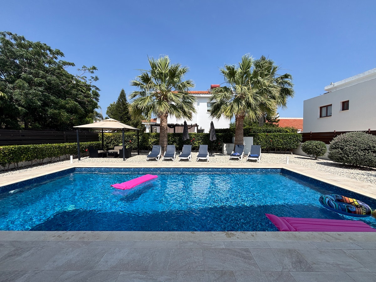 Reg. Number: AEMAK-PAF 0001032 Villa is near the beaches Coral Bay and Coralia in 2 minutes drive or 10 minutes walk, has private location, large swimming pool . Villa is equipped with all modern appliances and air conditioners. The restaurants, sport bars, supermarket are nearby. WiFi, Smart TV. Netflix available. !!! The electricity is over 25 kw per night is extra charged by meter. Swimming pool Is heated by request with a deposit approx. 10-20 euros per day depending on season.