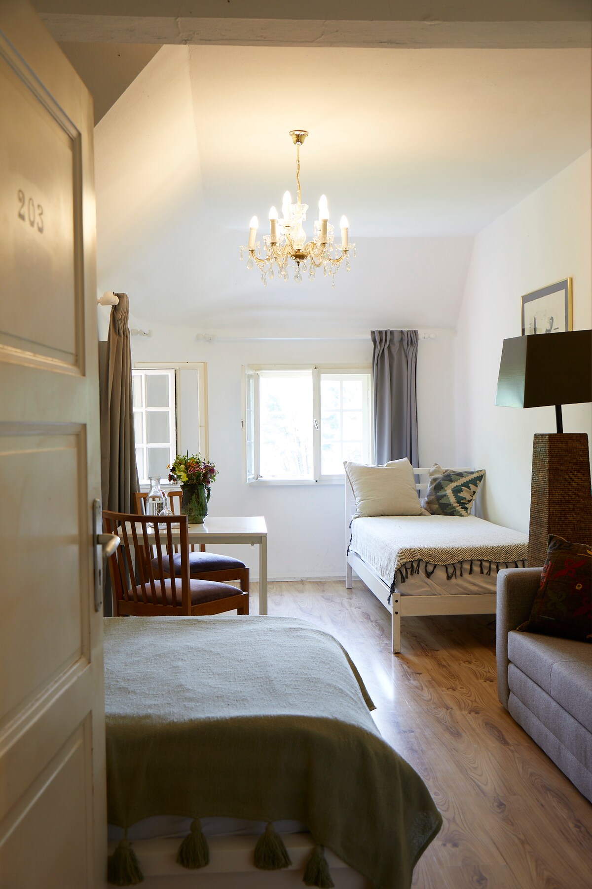 E2 / Gentlemen's room of the builder, Lieutenant Fritz Bullrich The master bedroom of the builder (1885-1938) impresses with a height of 3.30 m, exposed ceiling beams, oak herringbone parquet flooring and historic box transom windows. - Washbasin in the room / priv. shower and separate toilet opposite - Ground floor (6 steps) - Max 5 pers - Double 155 x 200 cm / pull-out double bed 160 x 200 cm / sofa bed 90 x 200 cm - 28 sqm / oak parquet flooring - 2 windows - Shared kitchen in the anteroom