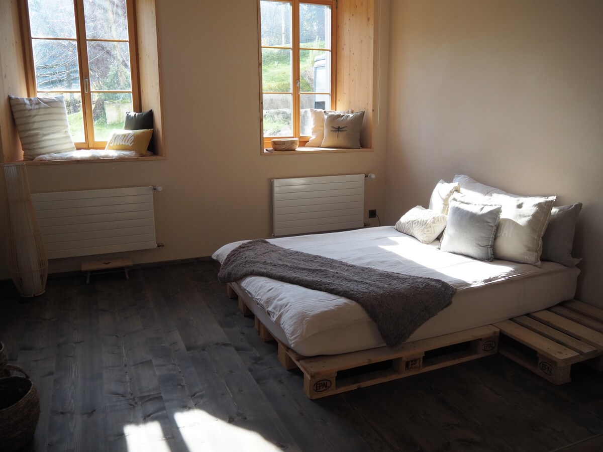 Unsere 2 Zimmer sind sehr romantisch, ruhig und in unserem schönen Bauernhaus mit hochwertigen Materialien und Liebe zum Detail gebaut. Beide Zimmer sind mit hochwertigen Boxspringbetten 220 x 200cm ausgestattet. Das BnB bietet eigene Eingänge, Bäder. Das self-service Frühstück ist einfach (Kaffee, Tee, Saft, Toast, Käse, Joghurt, Cerealien, etc.). Es kann im unbeheizten Vorraum zubereitet und im Zimmer eingenommen werden. Parkplätze sind vorhanden, die Busstation ist 1 Km entfernt.