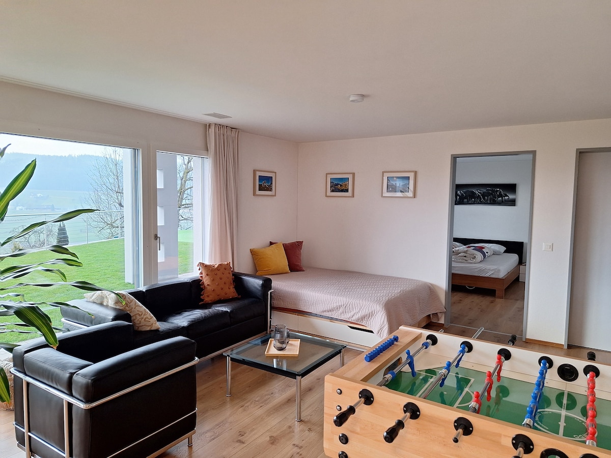 Vielleicht die überwältigendste Aussicht der Gegend. Suchst du Ruhe und Entspannung und liebst Privatsphäre? Vielleicht doch lieber biken oder wandern? Mitten in der Natur und trotzdem erreichst du die Zentren Luzern, Zürich, Basel und Bern in 20-50 Minuten. Das Appartement ist geräumig, geschmackvoll eingerichtet und bietet Platz für 4 Personen. Der Balkon gehört zum Appartement und ist für die alleinige Nutzung. Küche mit Kühlschrank, Backofen, Kochherd und Kaffeemaschine, Sat TV, WiFi und PP.