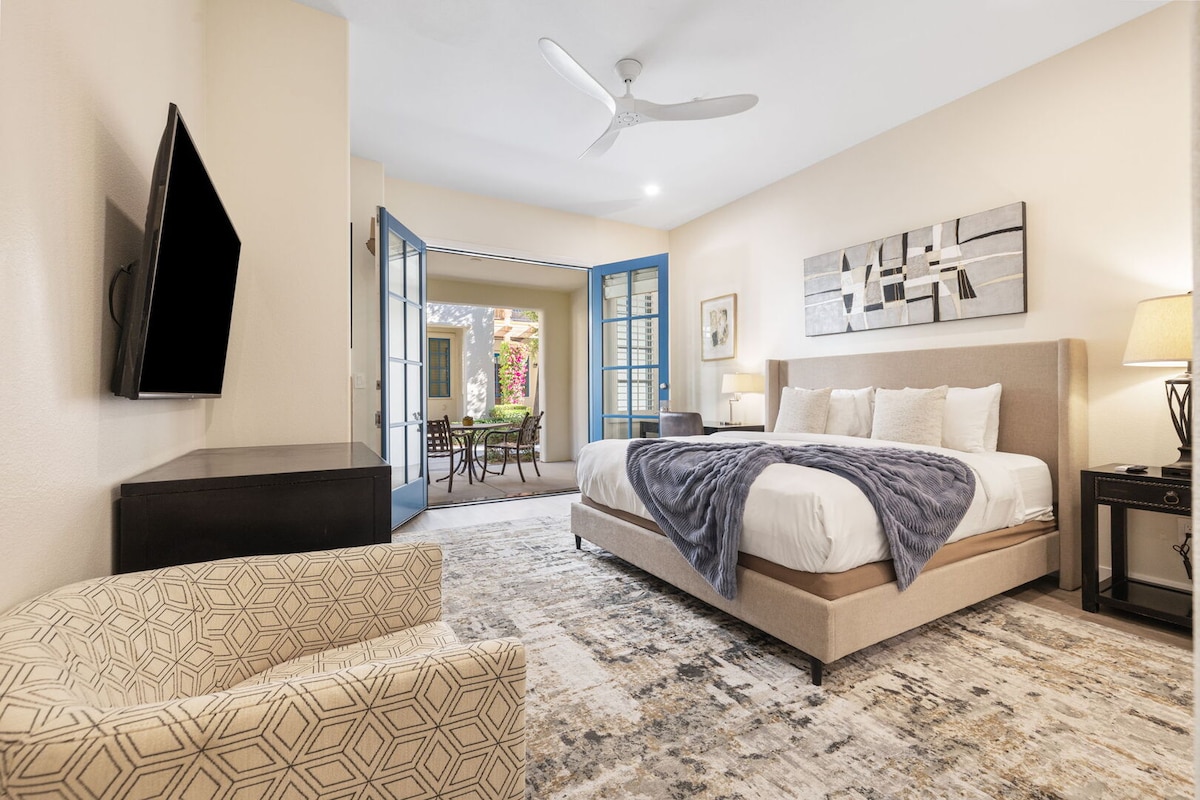 Relax poolside in this stylish king suite steps from one of the 12 pools in La Quinta's Legacy Villas. This suite includes 1 king bed, a kitchenette, a full bathroom, desk, TV, and a patio with dining set. Amenities within the community includes 12 pools, restaurant café, full gym, hammock village, clubhouse and more. Legacy Villas is located approximately 5 minutes from Old Towne La Quinta for easy access to dining, local pubs, and shopping. Permit No. 260156