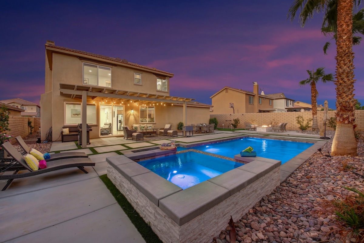 Aloha Palms welcomes you with its resort-style backyard and large spacious house overlooking the Terra Lago Golf Course. Featuring a custom outdoor kitchen, saltwater pool & spa, 3 fire pits & multiple outdoor seating areas. With the private casita & large main house, there is plenty of room. Massive Game Room featuring a Pool table, air hockey, darts, arcade games & Xbox gaming area & custom art murals. No coins needed… all FREE games! The perfect getaway for the whole family. MAX OCCUPANCY 10