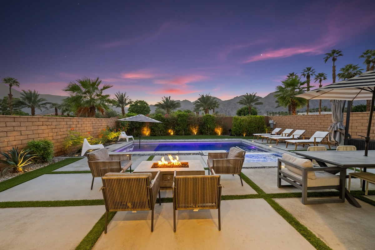 Brand newly decorated and updated 3020 sq. ft. executive home on the PGA West Nicklaus Course. Extra tall 12’ ceilings and beautiful design make this desert vacation home a luxury getaway. The perfect family getaway with a custom designed modern pool and sun shelf for little ones, with child safety alarms on doors to the pool for comfort of mind. Every detail has been considered from Kerurig coffee maker & espresso machine to the fire pit & comfortable gathering spaces for family & friends!