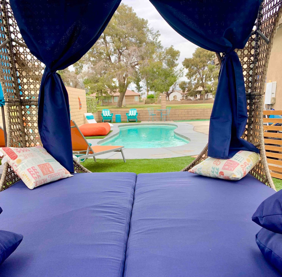 Welcome to your private desert oasis! Unwind and soak up the sun in our one-of-a-kind backyard retreat,featuring a spectacular private LAZY RIVER POOL A lazy river, crystal-clear Caribbean-style for endless floating fun, a “Tornado” waterslide, and a rainfall bridge. Enjoy in-pool loungers for ultimate relaxation, pool basketball, outdoor Bluetooth speakers, a BBQ grill, elegant dining and lounge areas,and a soothing hot tub for starry desert nights Your unforgettable desert getaway starts here
