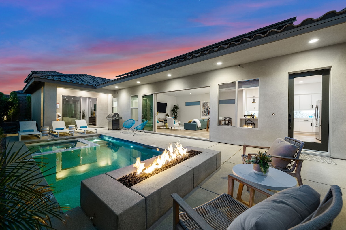 Brand newly decorated and updated 3020 sq. ft. executive home on the PGA West Nicklaus Course. Extra tall 12’ ceilings and beautiful design make this desert vacation home a luxury getaway. The perfect family getaway with a custom designed modern pool and sun shelf for little ones, with child safety alarms on doors to the pool for comfort of mind. Every detail has been considered from Kerurig coffee maker & espresso machine to the fire pit & comfortable gathering spaces for family & friends!