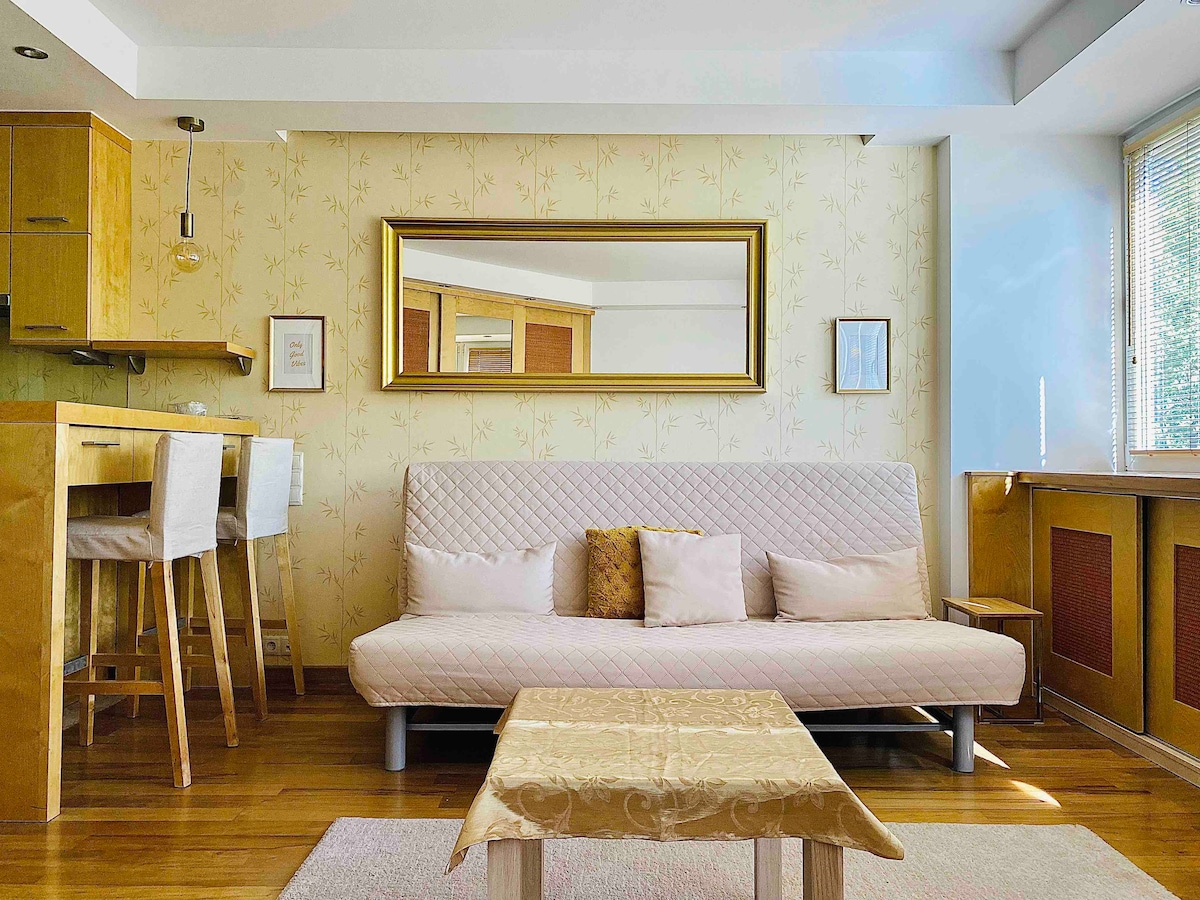 Hi, Cześć, Welcome! Saska Kępa Studio apartment is a cosy and fully equiped space in the heart of popular Saska Kępa district - just across the river from city Center! The apartament is on the ground floor of a residential building complex (security, minitoring) next to Rondo Waszyngtona. The apartment comprises of a corridor, a living space with a sofa, dining table and a kitchen, a sleeping annex, a bathroom with a shower. Next to Vistula river and PGE National Stadium. Come visit Warsaw !