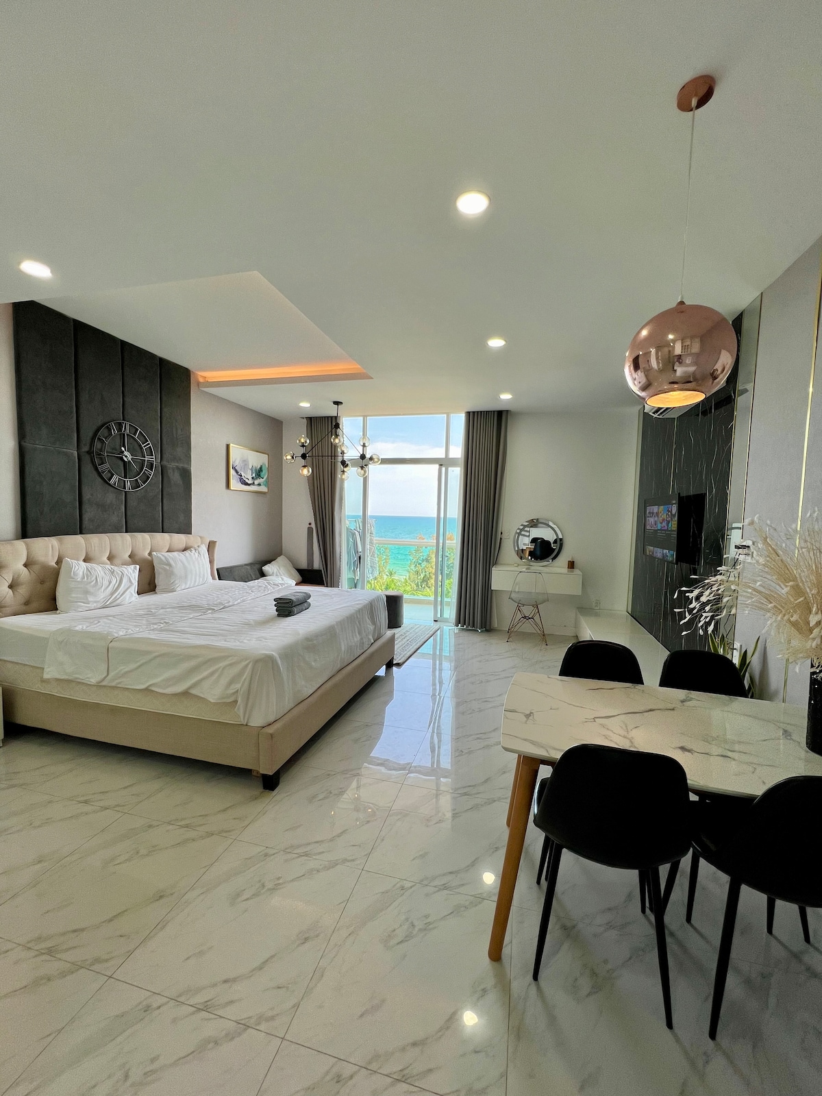 Căn hộ studio 32m2 có nội thất sang trọng với đầy đủ tiện nghi gồm: * 1 giường ngủ lớn 1m8 đầy đủ chăn ga gối nệm. * 1phòng vệ sinh & phòng tắm hiện đại được cung cấp đủ khăn, dầu gội, sữa tắm, máy sấy tóc… * 1 kệ bếp nhỏ được trang bị lò vi sóng, bình đun siêu tốc, tủ lạnh mini ( không hổ trợ nấu nướng tại căn hộ, chỉ có thể hâm nóng đồ ăn) * Tủ treo quần áo, bàn làm việc, tivi, wifi Cửa sổ lớn, View tầm cao hướng ra biển cực đẹp