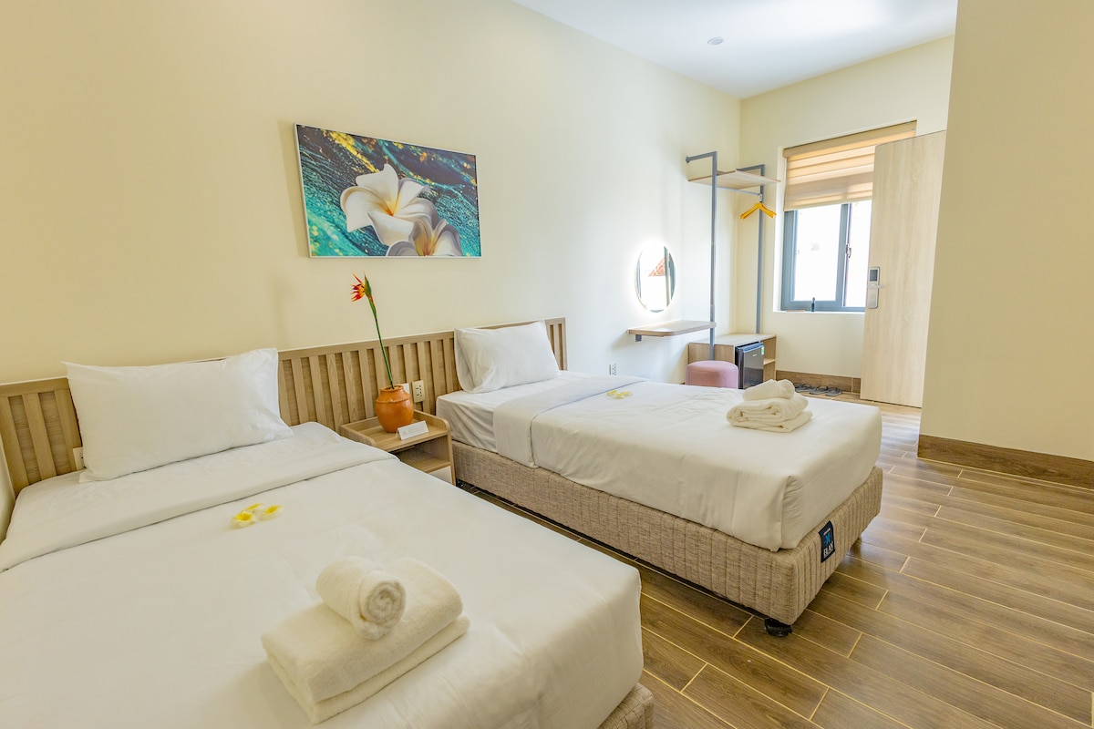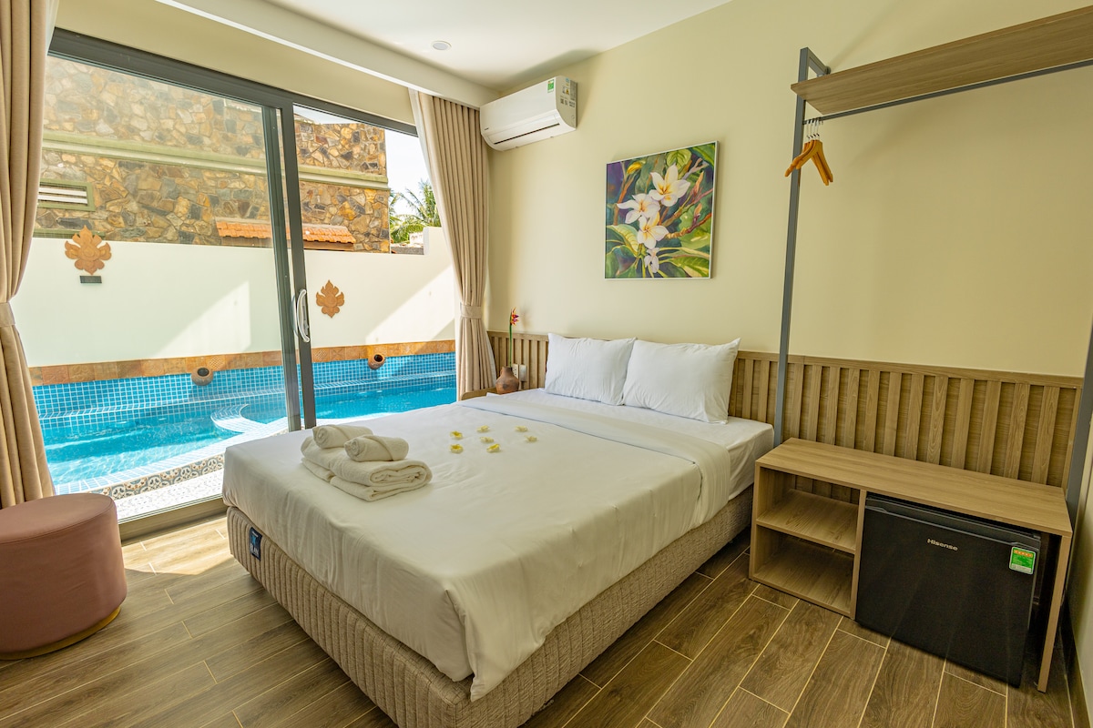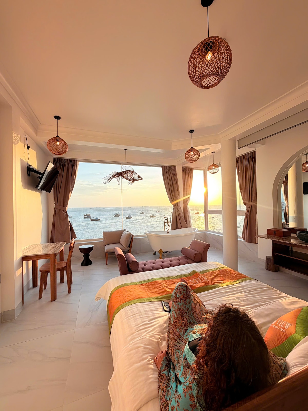 Discover serenity in our intimate room for two at Lotus Garden Resort. Adorned with unique decor, it blends artistry with comfort. Enjoy a garden view, and unwind some extra services: breakfast buffet, sauna, tour guide, and massage services. A one-minute walk brings you to the ocean, where you can relish the beauty of the sunset. Our central location provides easy access to many attractions, like Fairy Stream, Orange Sand Dunes, Mango Beach, Wine Castle, etc. only within 5-15 min drive