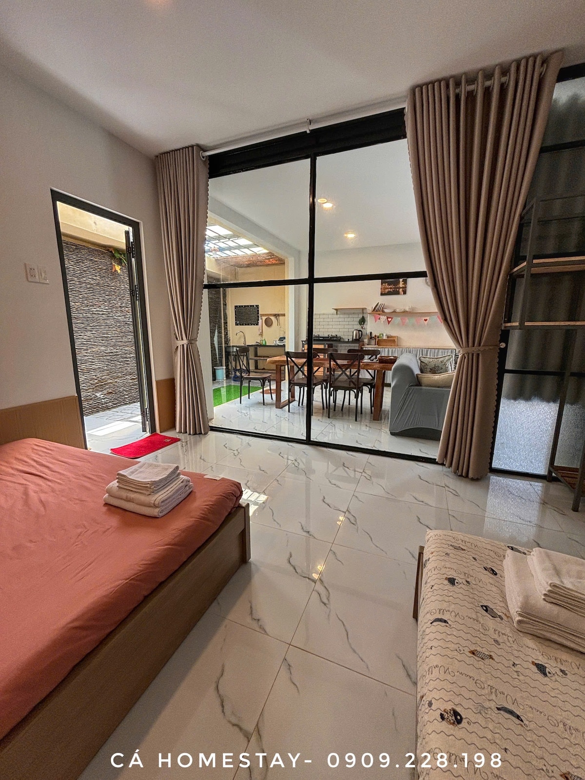 Nhà Cá nằm nép trong một con ngõ nhỏ yên tĩnh ngay trung tâm Phan Thiết, nhà gồm 1 phòng khách, 2 phòng ngủ, bếp, 1 WC tắm chung và khu vực tắm ngoài trời. Nhà Cá có 2 phòng ngủ với giường tiêu chuẩn 1m6, có vườn rau xanh phía sau, cây ăn trái trong vườn đã sai quả. Nhà mặt phố nên có chỗ đậu xe 4-7 chỗ ngay trước nhà. Nhà ở khu vực tương đối yên tĩnh và gần chợ, có bếp đủ tiện nghi, sẵn máy giặt, máy sấy nên thích hợp cho gia đình có con nhỏ hoặc nhóm bạn cần ở dài ngày.