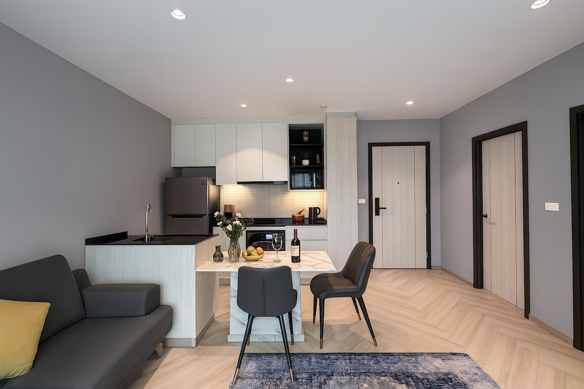 Step into a modern one-bedroom apartment designed with elegant contrast and refined simplicity. The thoughtful layout combines tropical serenity with contemporary design, creating a tranquil retreat just moments from Bang Tao Beach. The fully furnished interior exudes warmth and sophistication, featuring a living and dining area that opens onto a partly covered terrace — the perfect spot to unwind, dine, or entertain outdoors. Every element is designed to balance style and comfort. Stil.