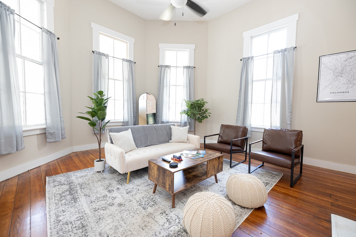 Take it easy at this unique and tranquil getaway. Tastefully designed cottage a few blocks from restaurants, bars and shopping in downtown Columbus, and in walking distance (10 min by foot) from Synovus Park, yet far enough for a peaceful and quiet retreat. The home offers everything you need for a weekend getaway or a multi-month deployment. Chattahoochee Riverwalk and the Civic Center are just two blocks away. Few minutes drive to Fort Benning. All artwork is from local artists.