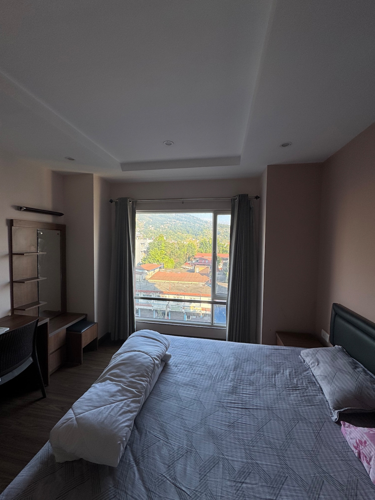 Stay at Tutmey Homes! Enjoy a cozy bedroom in our 3-bedroom apartment with 360° city & Himalaya views. Relax with premium bedding, Jacuzzi and steam(for additional cost). Access pool (Mon–Sat, 4–8 PM), gym, yoga hall, rooftop terrace, and secure parking. Modern comforts include AC, Wi-Fi, and smart TV. Perfect for a luxurious, relaxing getaway!