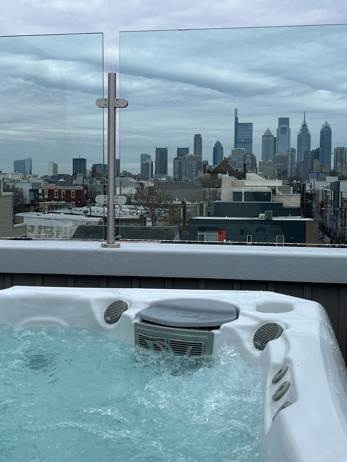 The Hot tub is Open! Enjoy our Center City house w large Private Roof Deck, Hot Tub, Fire Pit, and Private Garage Parking. Wide house showcases a great room with 20 ft ceilings and an 85 in flat screen television. Lux home. Perfect for large groups. Short walk to Philadelphia Convention Center and Reading Terminal Market. The house offers a mod kitchen and master suite. Within 5 minutes of Love Park, Independence Hall, Liberty Bell, and Museum District.