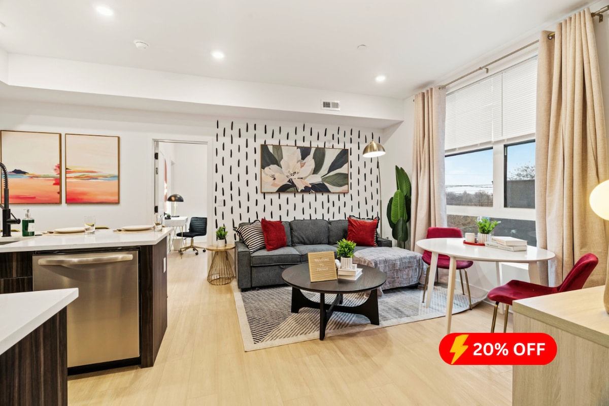费城市中心附近的新公寓,配备标准双人床、沙发床和洗衣房