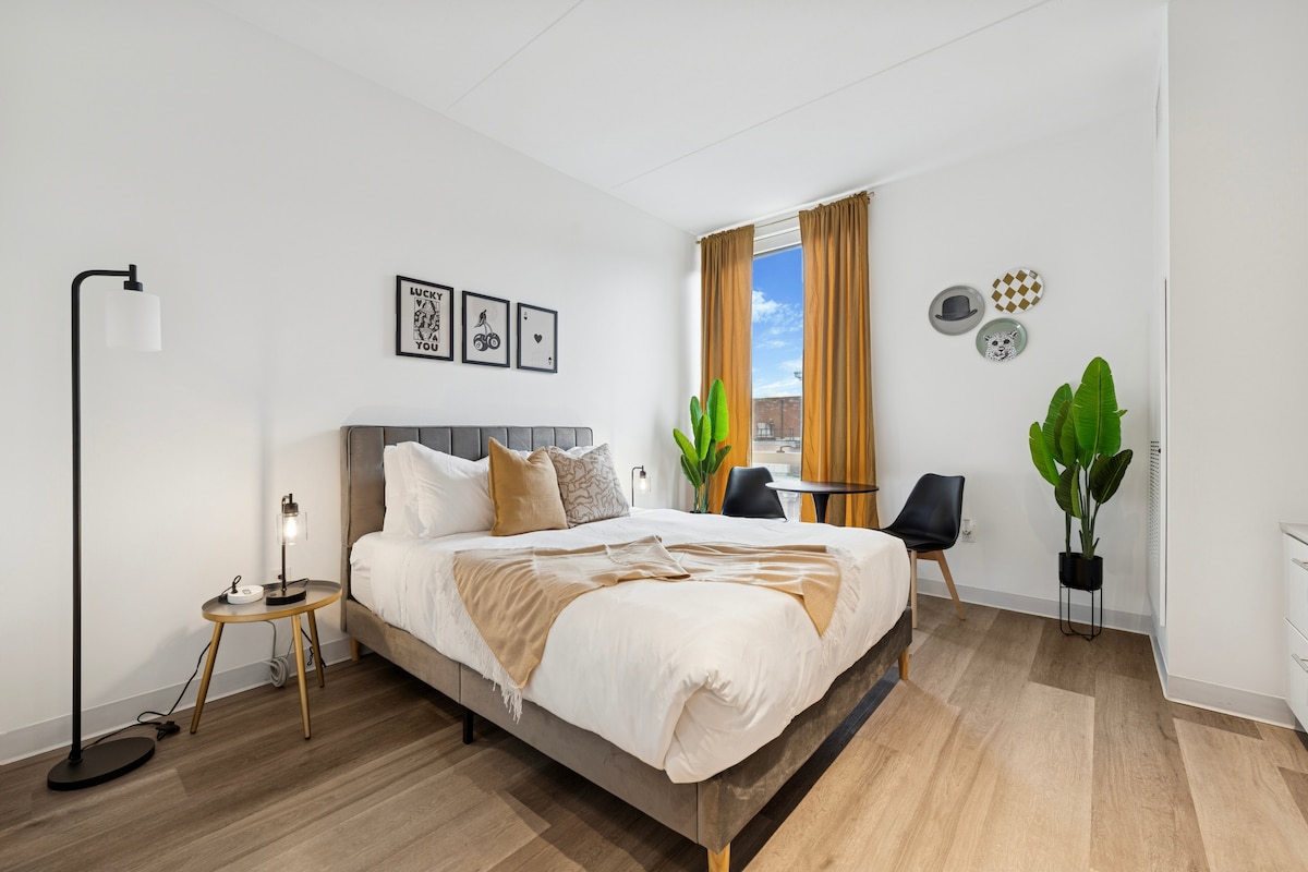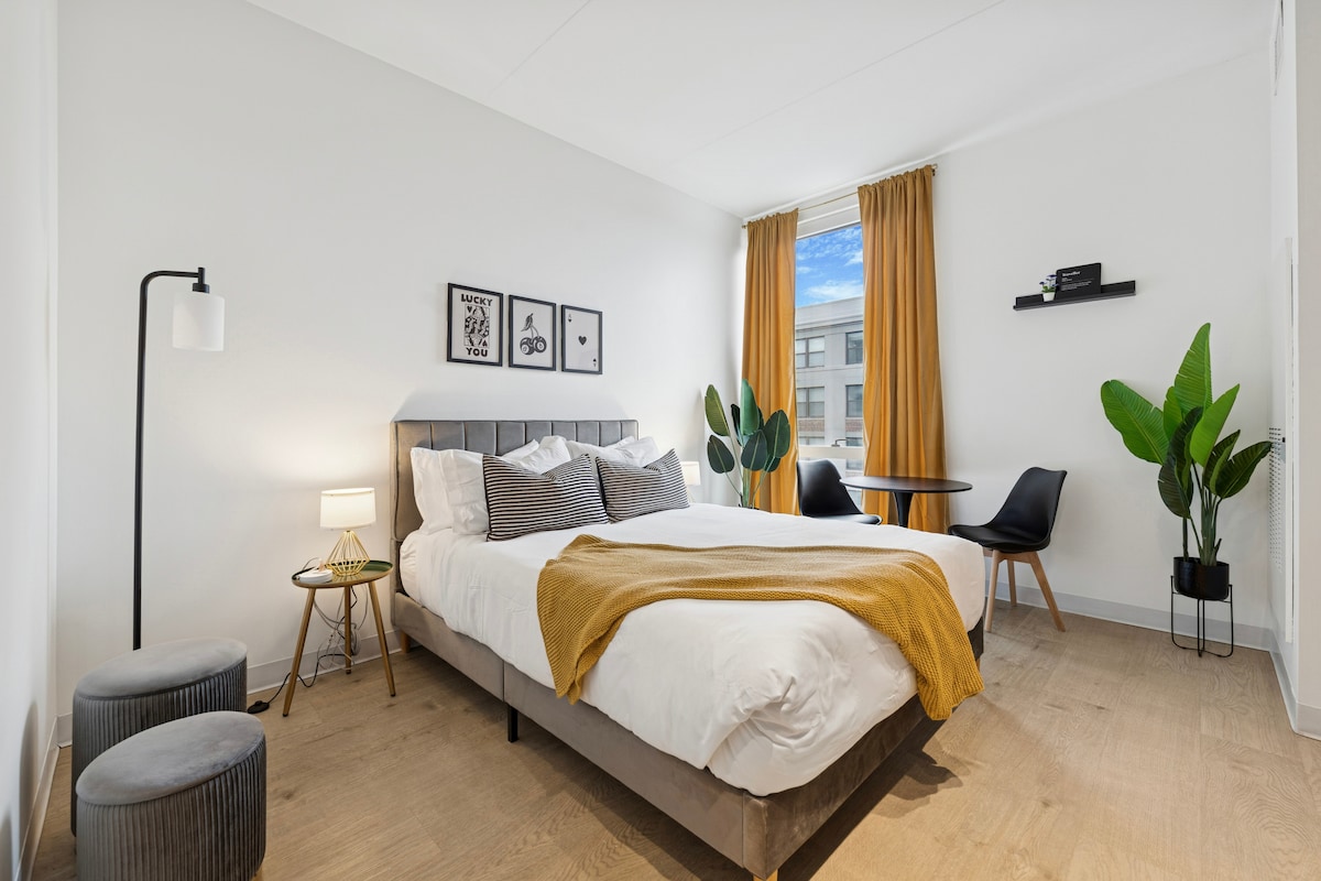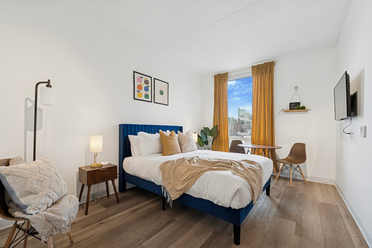 A bright and calming studio with inspiring views of the Philadelphia Skyline. Featuring a cozy queen sized bed, full kitchen, large stylish bathroom, and easy elevator access. Centrally located in Center City's Loft District perfect for tourist and work travelers, minutes away from Reading Terminal Market, Independence National Historic Park, National Constitution Center, Museum of the American Revolution, Art Museum, Rail Park, only steps to Philadelphia Convention Center, and City Hall.