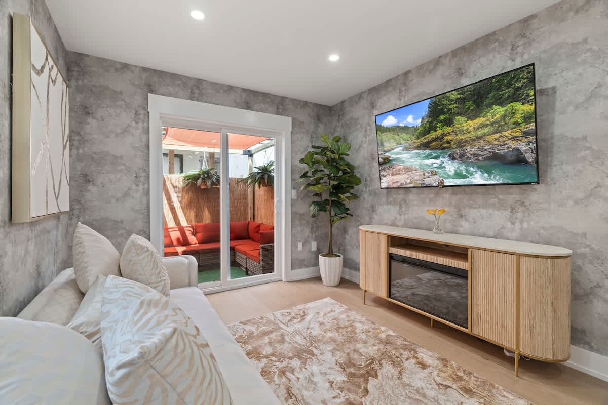 The Modern Gem Luxury Escape, where each detail ensures comfort, style, and entertainment. With a TV wall boasting four 65-inch screens, LED-lit beds, a cozy backyard with string lights and fire pit, every moment promises luxury and relaxation. Nestled just outside Center City, our location offers convenience and charm. You're within walking distance of the Philadelphia Art Museum, home to the iconic Rocky statue, allowing you to immerse yourself in the city's vibrant culture and history.