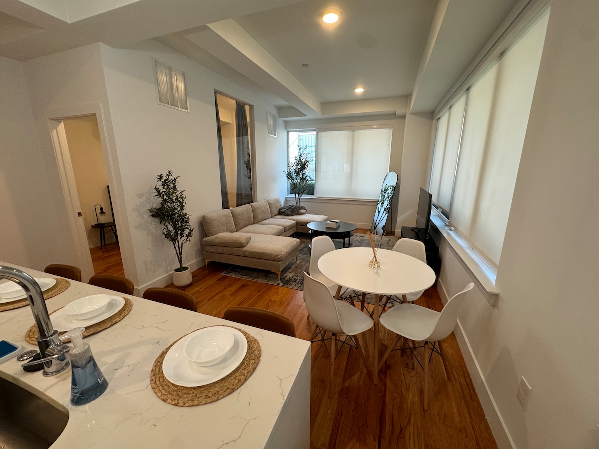 A bright and calming studio with inspiring views of the Philadelphia Skyline. Featuring a cozy queen sized bed, full kitchen, large stylish bathroom, and easy elevator access. Centrally located in Center City's Loft District perfect for tourist and work travelers, minutes away from Reading Terminal Market, Independence National Historic Park, National Constitution Center, Museum of the American Revolution, Art Museum, Rail Park, only steps to Philadelphia Convention Center, and City Hall.