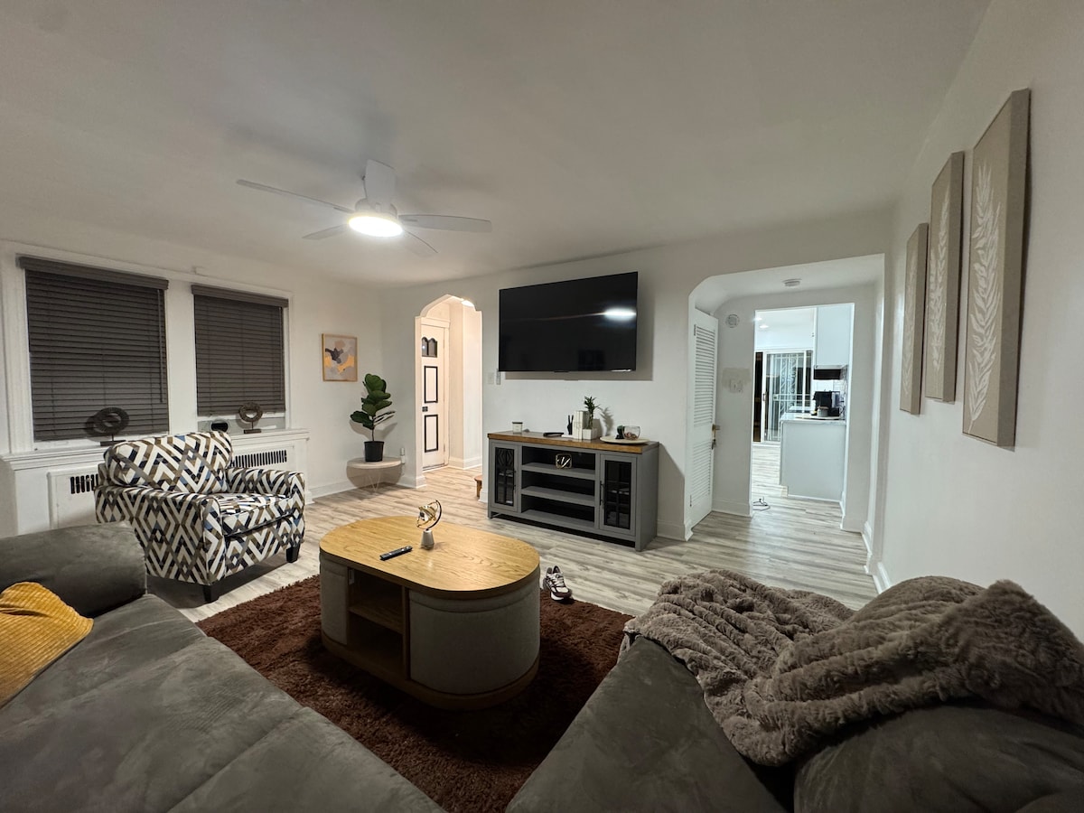The Blueprint is a cozy 3 bedroom apartment. The home is fully renovated. Hardwood floors throughout the living room, dining room and kitchen. Cleaning supplies are provided. 3 spacious bedrooms. Two twin beds, full bed & queen bed in the master bedroom. Upstairs bathroom is elegant with a monochromatic blue decor. Lastly, there is an inclosed porch that is available for smoking. The kitchen has all updated appliances and there is an electric fire place!