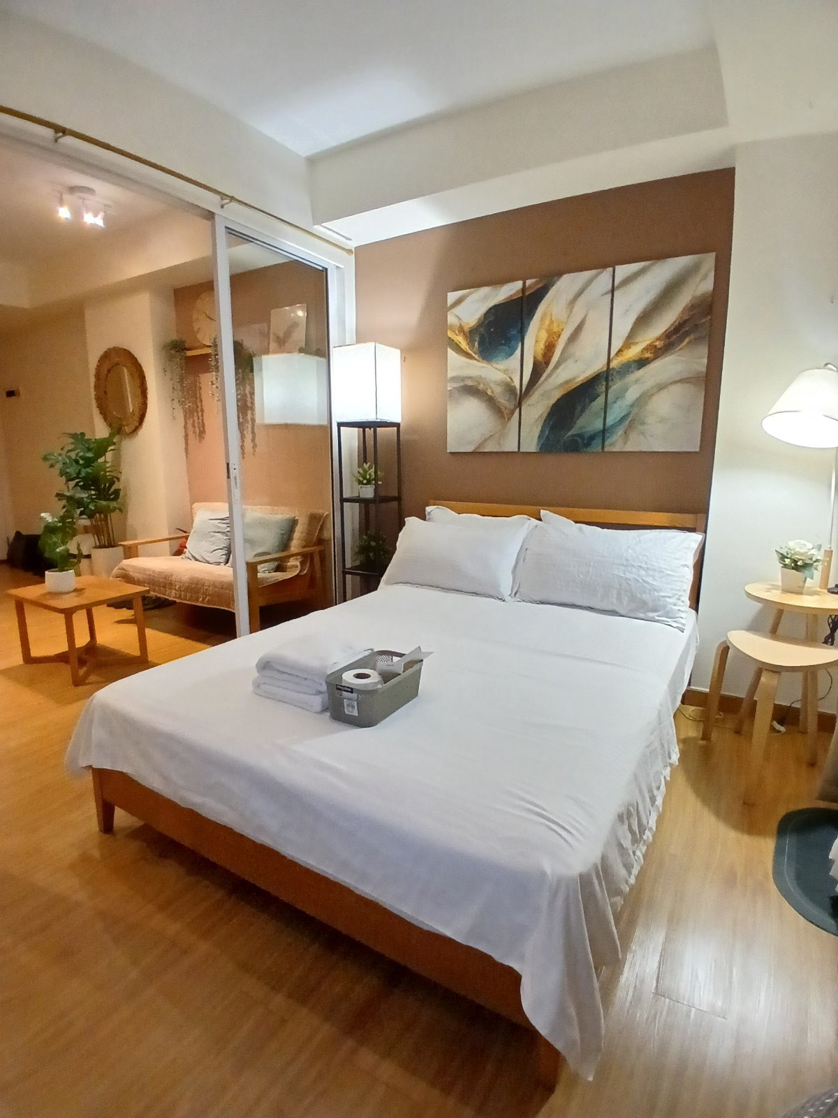 The location is just a walking distance to SM Bicutan and its only 15 minutes away from NAIA 1, 2 and 3. The rate is good for 2 but additional person is allowed up to 2 pax. A minimalist place with a touch of nature A great place that offers all you need for a short stay. Sleep like you are just at home. An ambiance of home is what we aim, enjoy your stay with your love ones here. We offer you a stylish, comfortable room, kitchenware, with wifi and smart tv for entertainment.