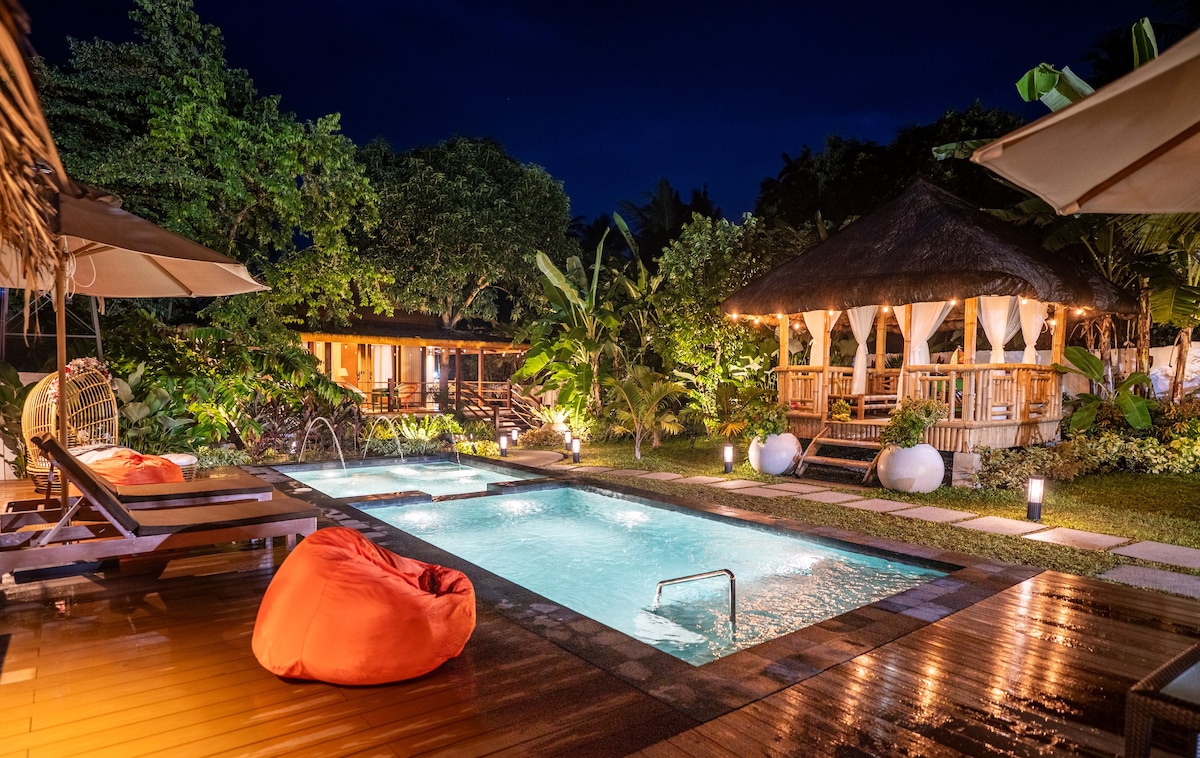 Welcome to Alegria del Rio Villa, where Filipino-Latin charm intertwines with luxury and adventure. Indulge in our exclusive amenities, including the Philippines' first rolling bed for stargazing, your private plunge pool, and a jungle-style shower cascading into your bathtub. Enjoy your favorite movie from the comfort of your bed or while soaking in the tub. Opt for our stylish Balsa service for optional drop-off and pick-up from the port. Escape to a blend of serenity and excitement—Book Now!