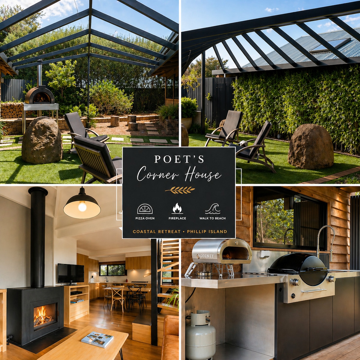 Escape to Poet’s Corner House, a peaceful Phillip Island retreat with a private fenced garden, outdoor kitchen, pizza oven, cozy fireplace, and sunlit loft lounge. Ideal for couples, small families, friends, and dog-friendly stays, the home is made for slow mornings, beach days, long garden meals, and relaxed evenings by the fire. Walk to Surf Beach and enjoy easy access to Cowes, San Remo, wildlife experiences, and the Penguin Parade.