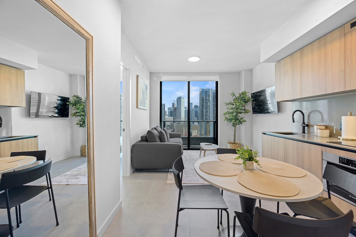 - Stay in a modern high-rise condo on the 17th floor in the heart of Downtown Miami. - Enjoy a comfortable 1-bedroom + den layout with 2 full bathrooms, ideal for families, small groups, or longer stays. - Relax in a bright living space featuring a Smart TV, open dining area, and fully equipped kitchen. - Take advantage of convenient amenities including in-unit washer and dryer and reliable high-speed Wi-Fi. - Explore nearby attractions such as Kaseya Center, Pérez Art Museum Miami, Frost Scienc