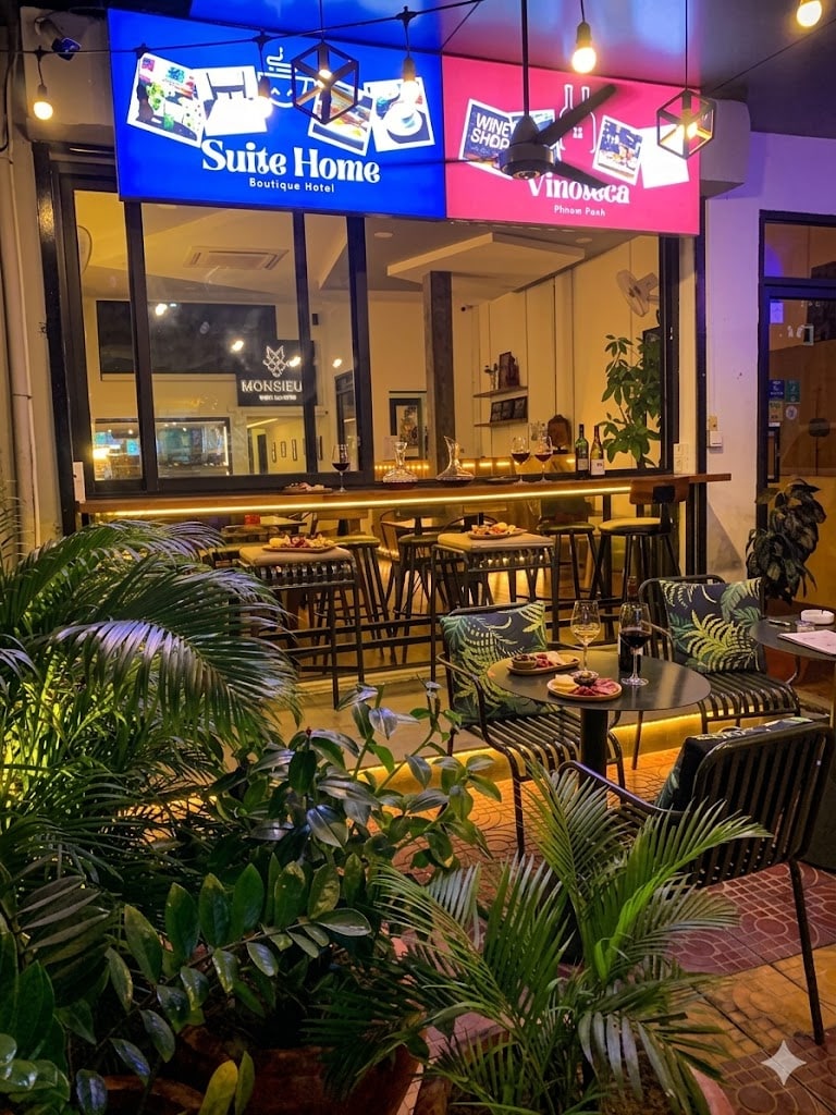 Le Suite Home boutique est idéalement situé au cœur du quartier touristique, à moins de 10 minutes à pied du Musée national du Cambodge et du Palais royal. Le hall et la terrasse de l'hôtel ont été réaménagés pour offrir à nos hôtes un espace de détente où ils peuvent déguster un excellent café local, chaud ou glacé, ou un délicieux verre de vin à petit prix dans notre bar à vin, tout en contemplant l'art khmer, ce qui en fait un endroit agréable où séjourner après une journée de visites.