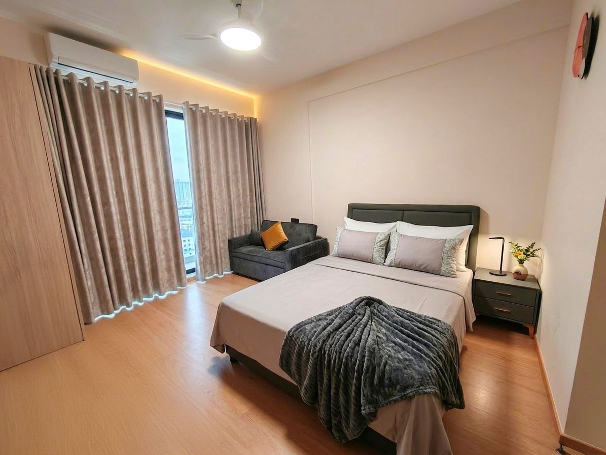 Our elegant 2-bedroom, 1.5-bath executive residence is fully furnished to hotel standards and set on a high floor with stunning panoramic city views. Minutes from NagaWorld and Koh Pich, it’s ideal for business travelers, couples, families, or long stays. Includes a spacious living room, modern kitchen, high-speed Wi-Fi, washer, private bath + guest half bath. Amenities include iron, hair dryer, kettle, fridge, towels, and toiletries for a comfortable luxury stay in Phnom Penh.