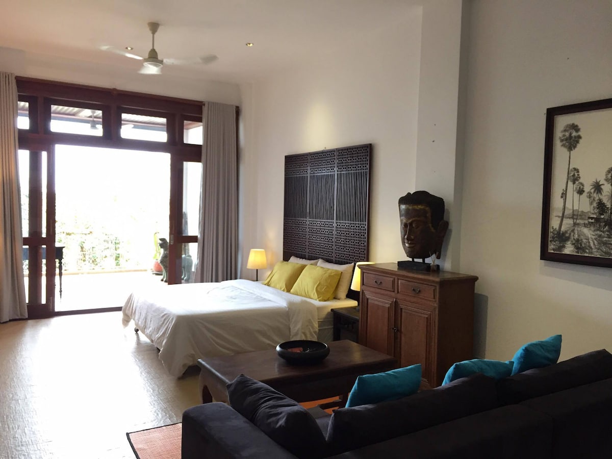 Riverside Studio is located at the heart of Phnom Penh's Riverside Promenade, right next to the popular "La Croisette" restaurant. On the second floor of a classic 1940's colonial building and with a private and secure (24 hour guards) entrance, you'll be where the action is. The Royal Palace, National and Sosoro Museums, Night Market, and the Bassac Lane are all reachable within minutes. The apartment is very quiet, offers exclusive privacy and has a spacious balcony.