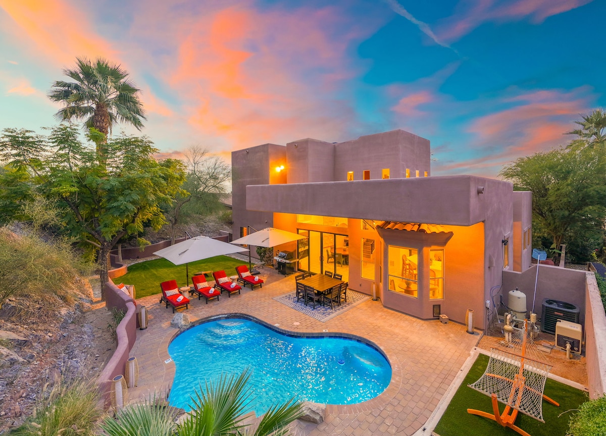The Hillside Oasis is a STUNNING multi-level retreat offering an elevated blend of luxury and comfort. Centrally located just minutes from Biltmore, Paradise Valley, Scottsdale, and steps away from Piestewa Peak this location is perfect for travelers sight seeing, golfing, hiking, or an executive stay. This incredibly spacious, professionally designed retreat features modern living throughout, 3 king beds, a heated pool, fire pit, and breathtaking panoramic views—all with the comforts of home.