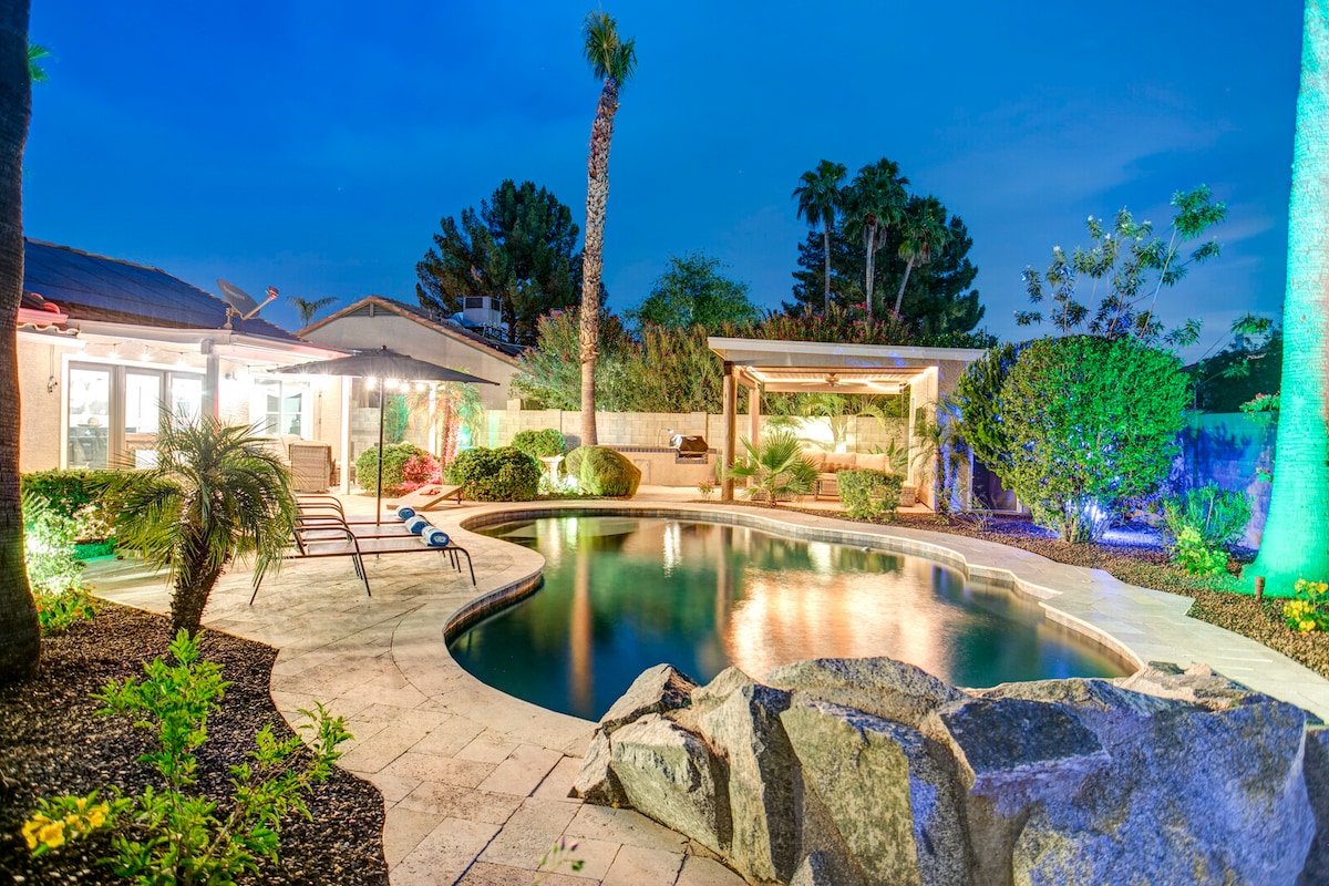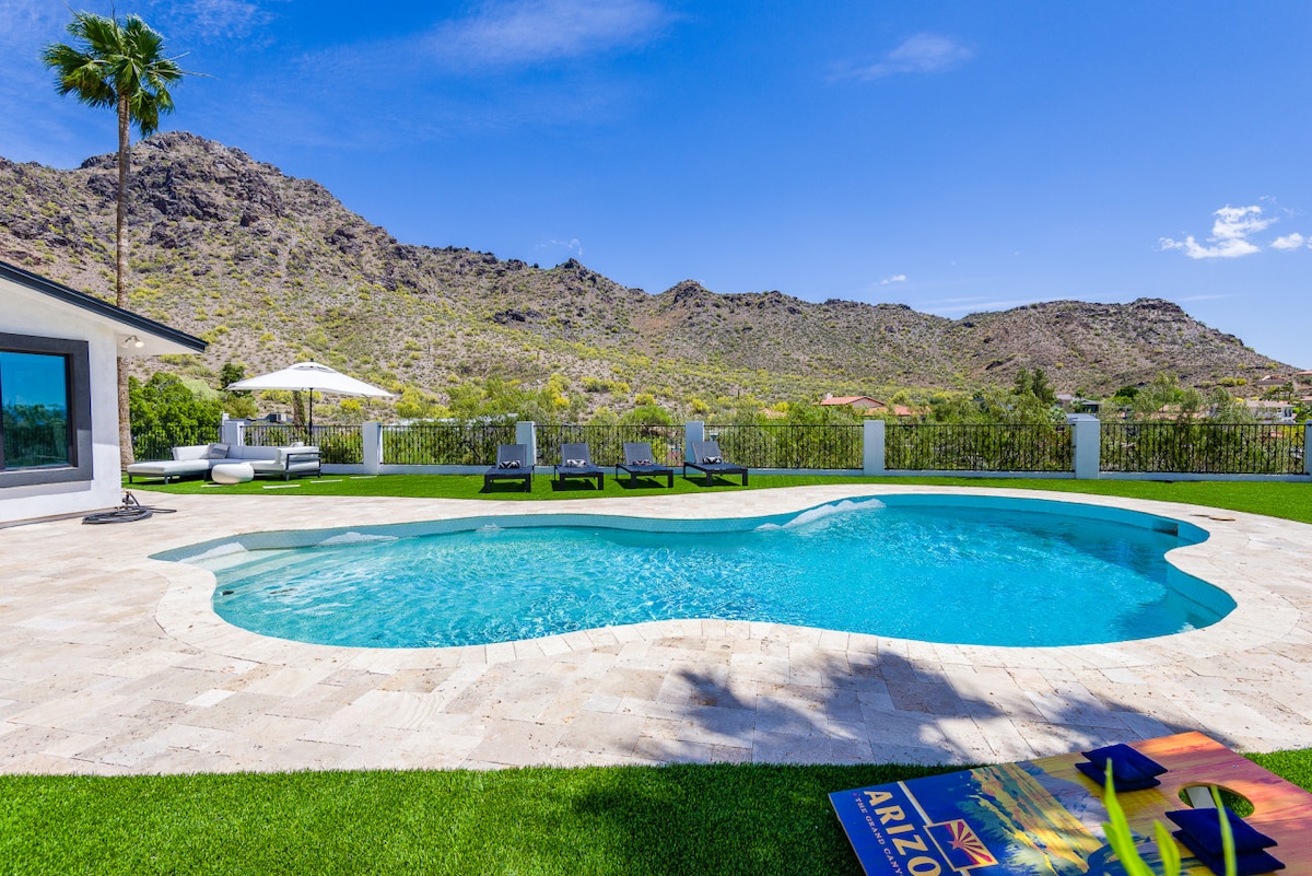 Welcome to The Hidden Hacienda Scottsdale! A fun, whimsical retreat with cowboy-chic decor, pool, spa, karaoke, and games—perfect for bachelorettes, families, or golf getaways. Sleeps 10 with comfy beds, smart TVs, a pool table and a fully stocked kitchen. Lounge beneath swaying palm trees, practice your swing on the mini putting green, or unwind in your private backyard oasis with cozy seating fire-pit and outdoor tv. Minutes to Kierland Commons, top golf courses, Spring Training and more!