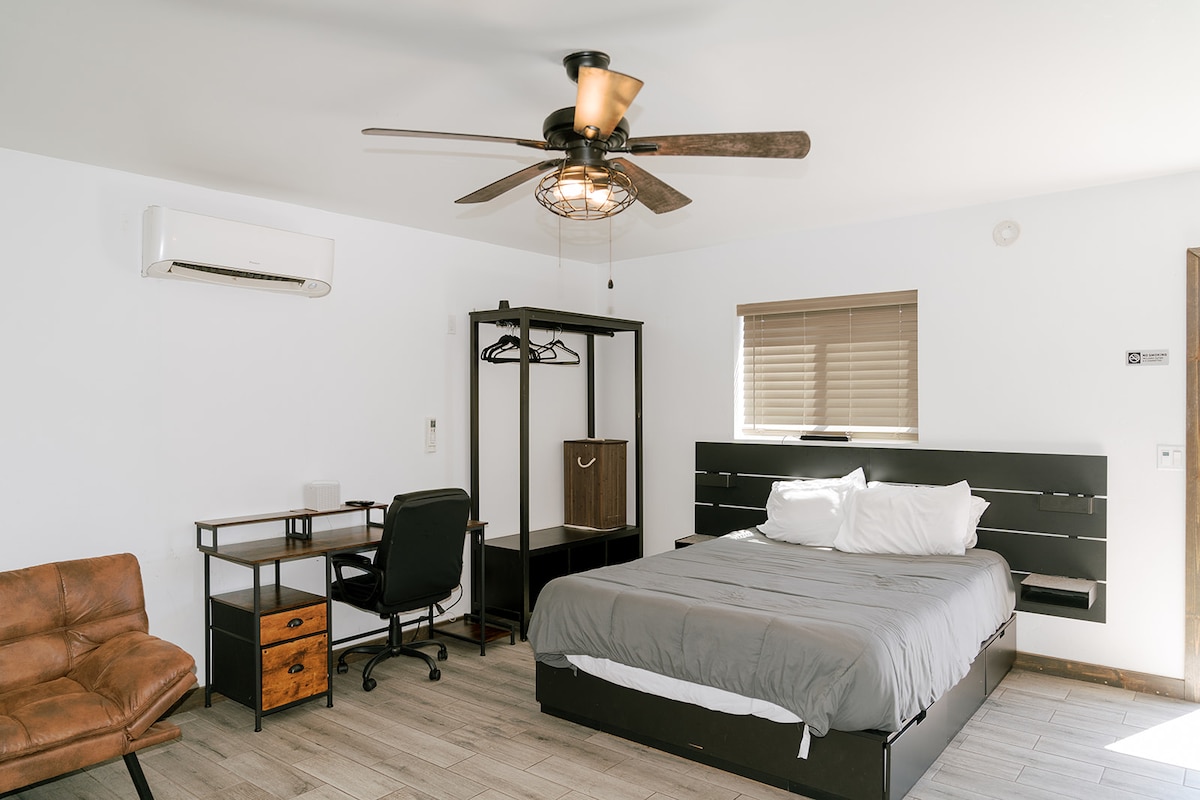 A contemporary industrial designed studio with sealed distressed cement floors and exposed pipes. A grey water system irrigates the lush southwest gardens. Be adventurous and choose the outdoor shower in the enclosed back patio to fully appreciate the warm weather! Tucked away in the historic F.Q. Story Neighborhood in downtown Phoenix. You are surrounded by charming historic homes as you walk the neighborhood. Close to local eats, parks, and museums. EVERYONE is welcome at Studio B!