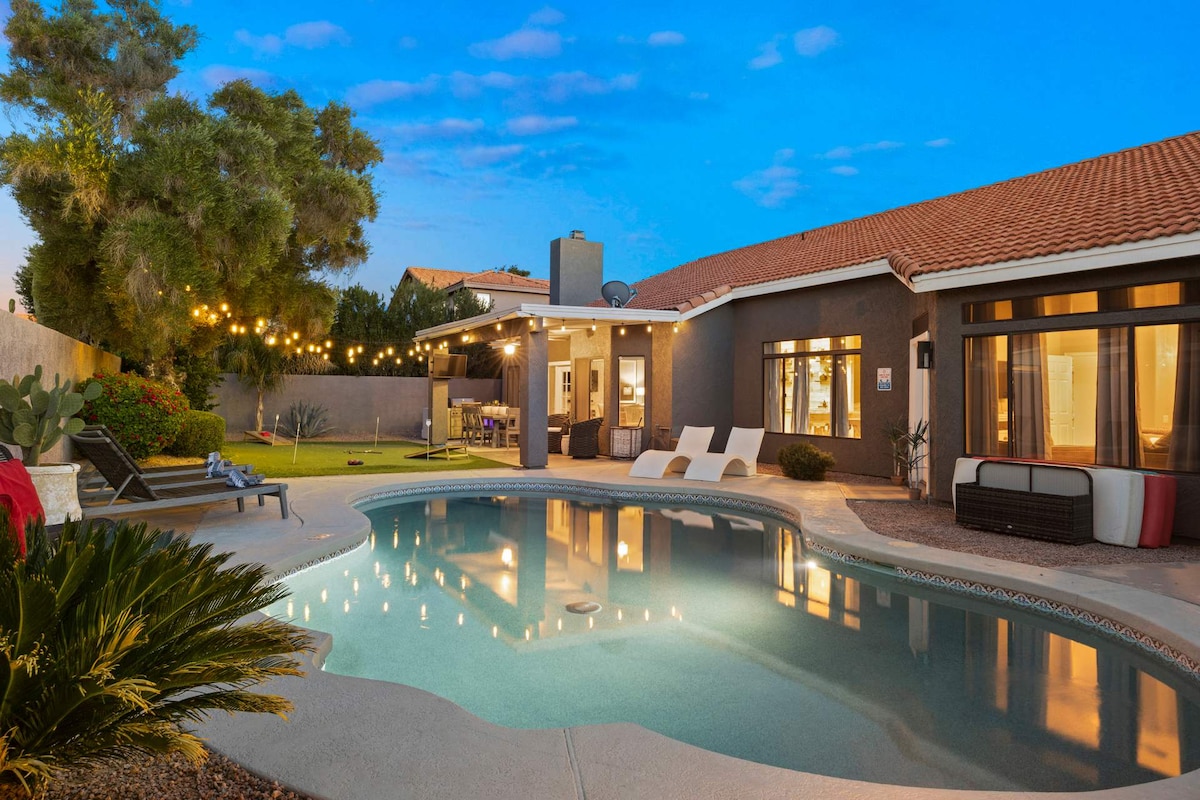 Welcome to your ultimate Scottsdale retreat! Our spectacular home is a professionally designed haven built for fun and relaxation. You'll love the chef’s kitchen and our jaw-dropping luxury backyard complete with a heated pool, spa, sauna, pickleball court, putting green, and a full outdoor kitchen. Inside, perfect your swing with a golf simulator! We are perfectly situated near top-tier golf courses, premier shopping, and the vibrant nightlife of Old Town Scottsdale.