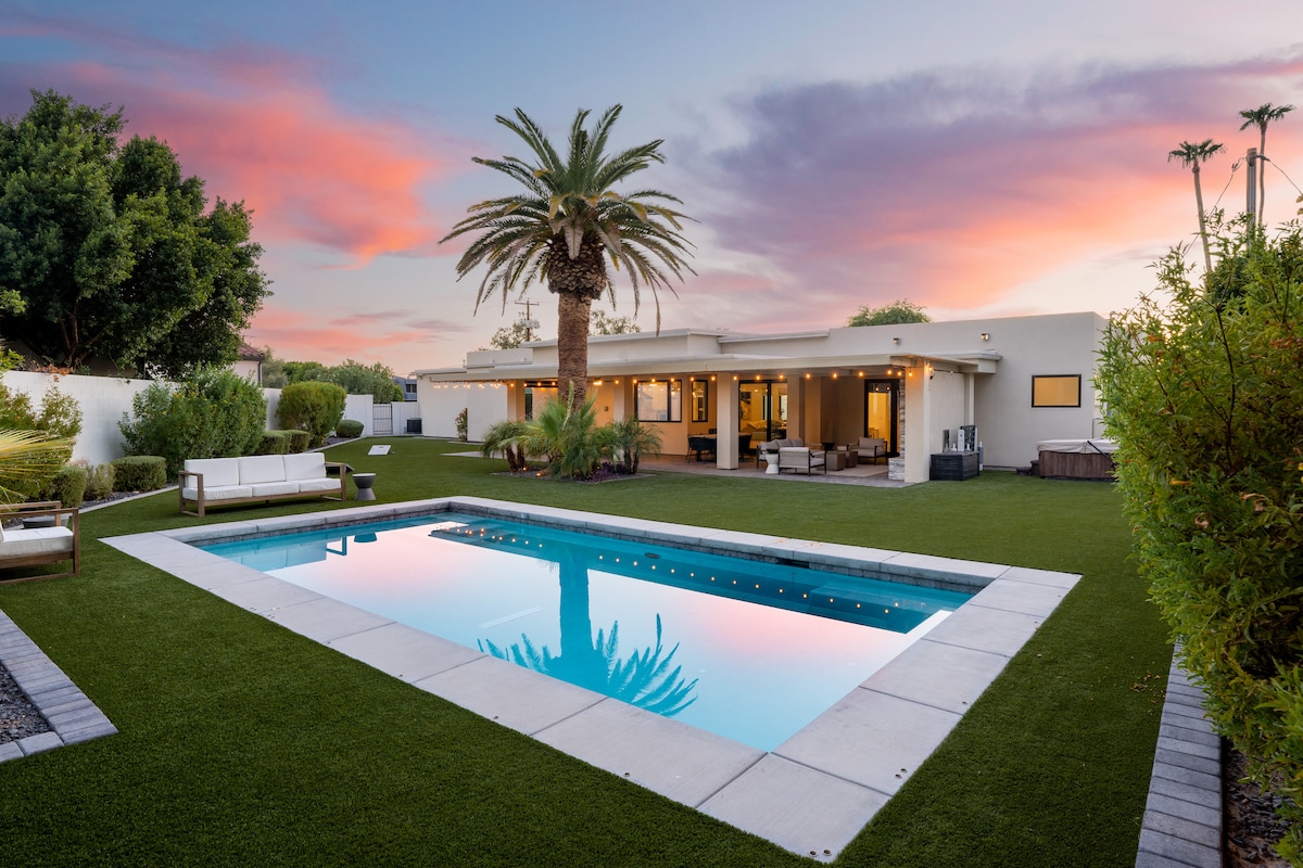 Tequila Time Retreat: A SW-Inspired 4BR Pet Friendly retreat! Centrally located near golfing gems, upscale shopping at Kierland Commons & Scottsdale Quarter, and the esteemed Mayo Clinic. Dive into modern luxury with our recently remodeled open-concept space & dedicated Tequila Time Bar. Relax in the primary suite's spa-like bath or venture out to the private backyard featuring a custom pool, 8-person spa, and ping pong under the ramada. Book for a 5-star Scottsdale escape!