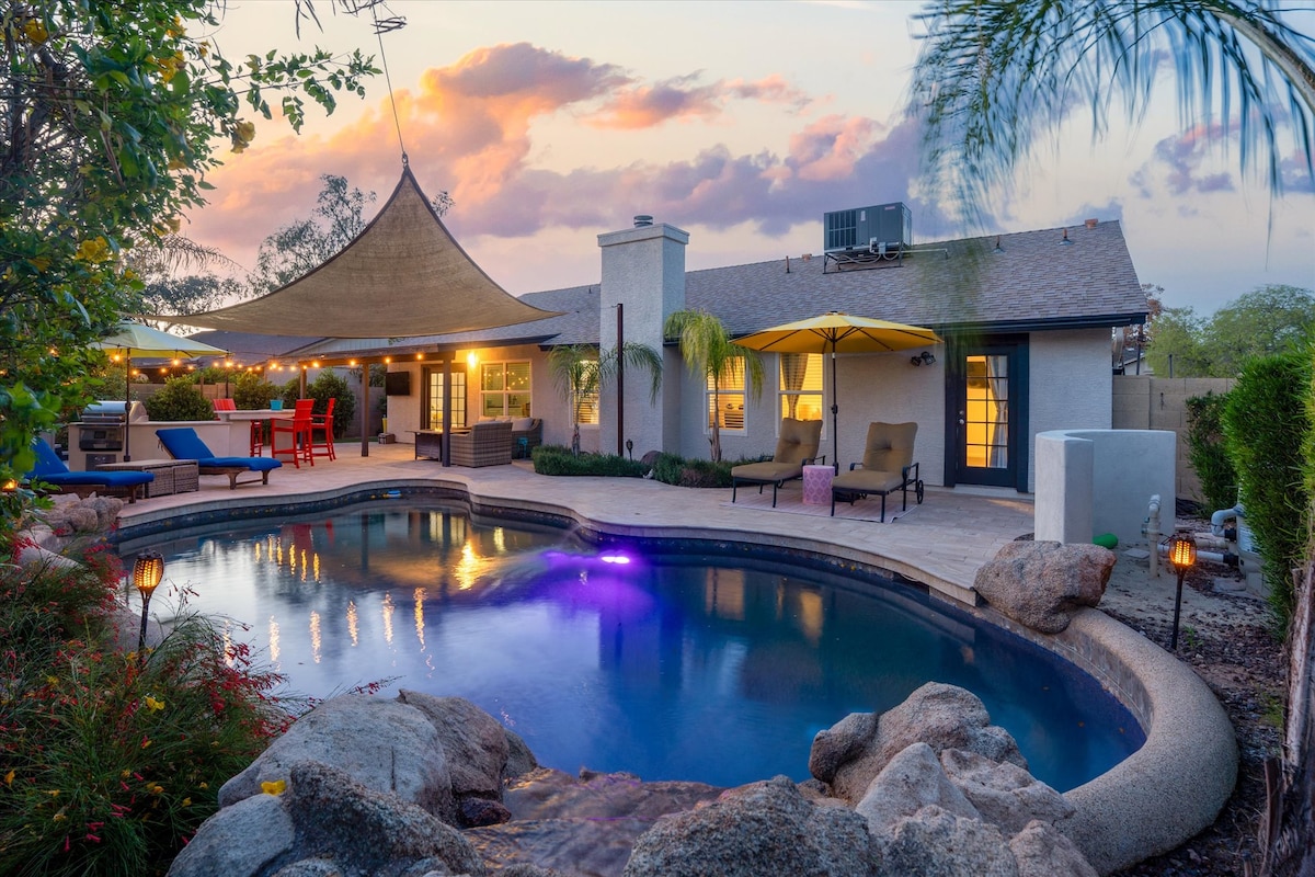 Tequila Time Retreat: A SW-Inspired 4BR Pet Friendly retreat! Centrally located near golfing gems, upscale shopping at Kierland Commons & Scottsdale Quarter, and the esteemed Mayo Clinic. Dive into modern luxury with our recently remodeled open-concept space & dedicated Tequila Time Bar. Relax in the primary suite's spa-like bath or venture out to the private backyard featuring a custom pool, 8-person spa, and ping pong under the ramada. Book for a 5-star Scottsdale escape!