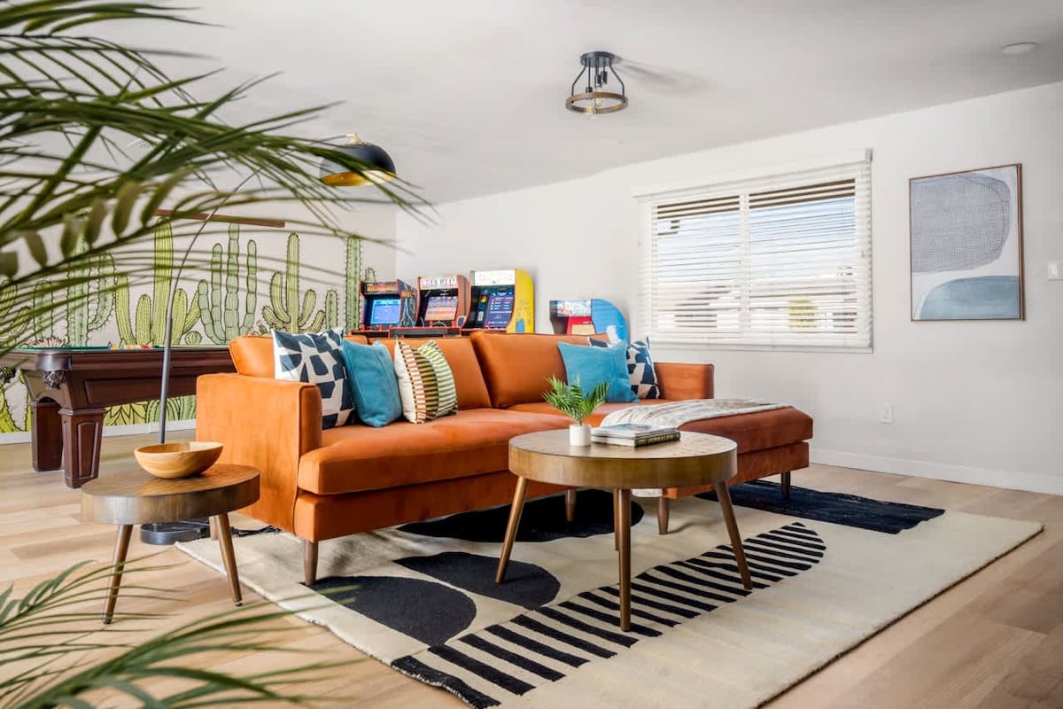 Welcome to The Hidden Hacienda Scottsdale! A fun, whimsical retreat with cowboy-chic decor, pool, spa, karaoke, and games—perfect for bachelorettes, families, or golf getaways. Sleeps 10 with comfy beds, smart TVs, a pool table and a fully stocked kitchen. Lounge beneath swaying palm trees, practice your swing on the mini putting green, or unwind in your private backyard oasis with cozy seating fire-pit and outdoor tv. Minutes to Kierland Commons, top golf courses, Spring Training and more!