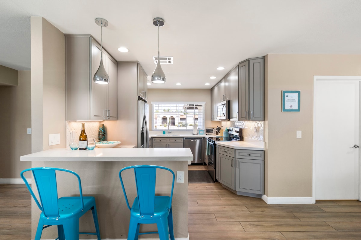 Welcome to The Hidden Hacienda Scottsdale! A fun, whimsical retreat with cowboy-chic decor, pool, spa, karaoke, and games—perfect for bachelorettes, families, or golf getaways. Sleeps 10 with comfy beds, smart TVs, a pool table and a fully stocked kitchen. Lounge beneath swaying palm trees, practice your swing on the mini putting green, or unwind in your private backyard oasis with cozy seating fire-pit and outdoor tv. Minutes to Kierland Commons, top golf courses, Spring Training and more!