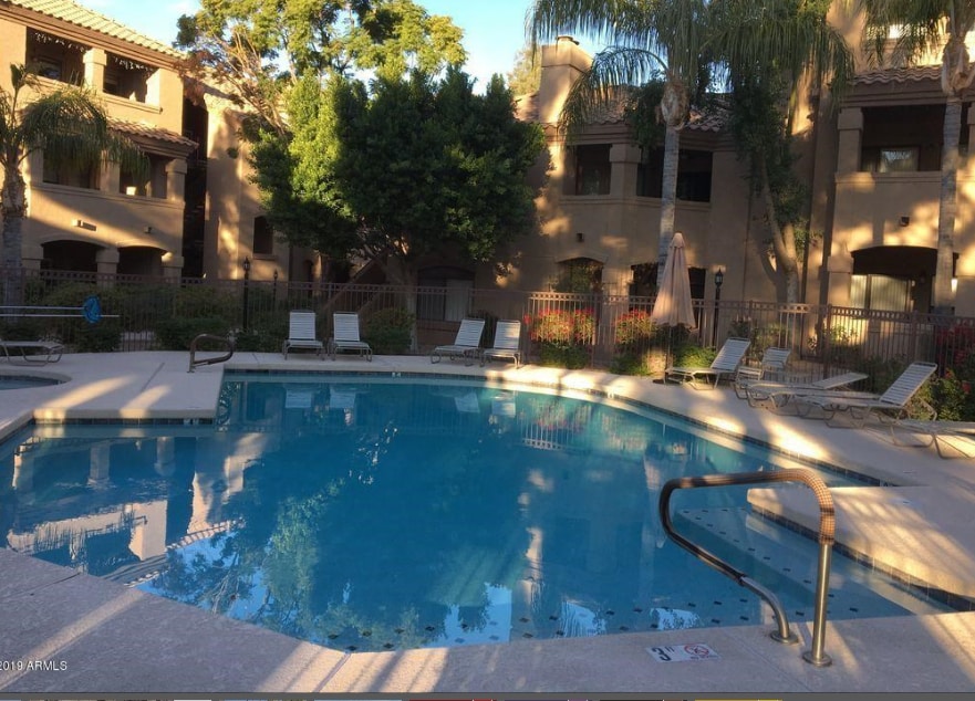 location....Location......Location. Recently remodeled condo directly across the street from everything including; shopping, entertainment, and restaurants. Condo is located front and center, top floor overlooking the pool. End unit, very private. Enjoy sunrise, sunsets, and palm tree's as well as pool viewings from balcony. View of mountains from front, picture of pool is taken from balcony. Walking distance to Giants stadium, fashion square mall and anything you desire. license # 2034786